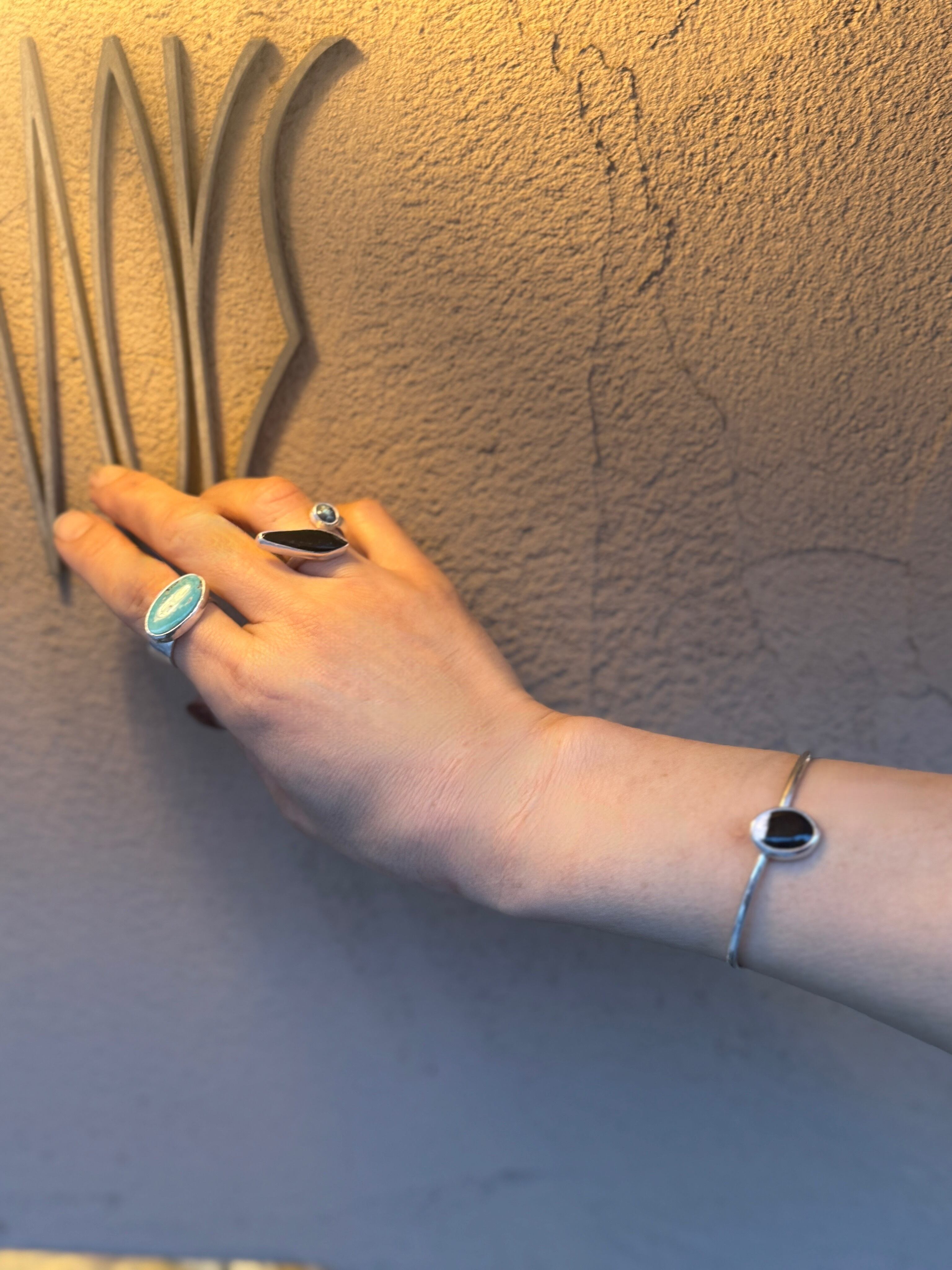 ターコイズブルーらしい鮮やかな楕円形のroyston ルースを真横につけリングにしました。