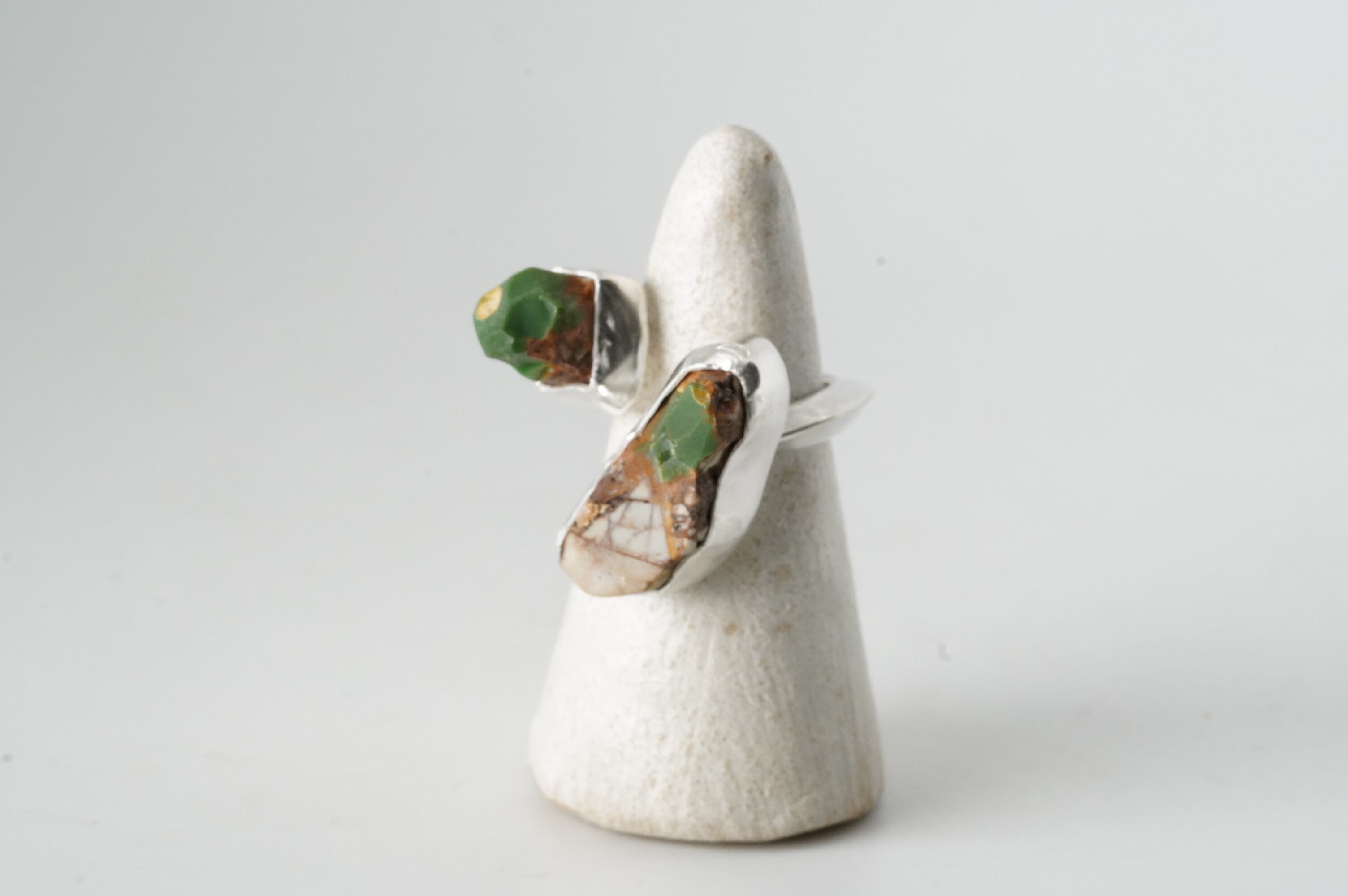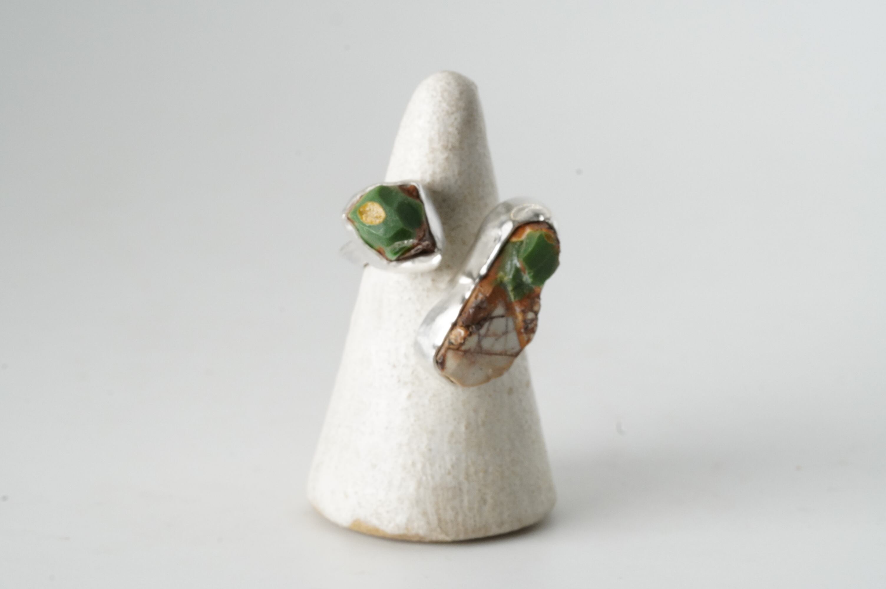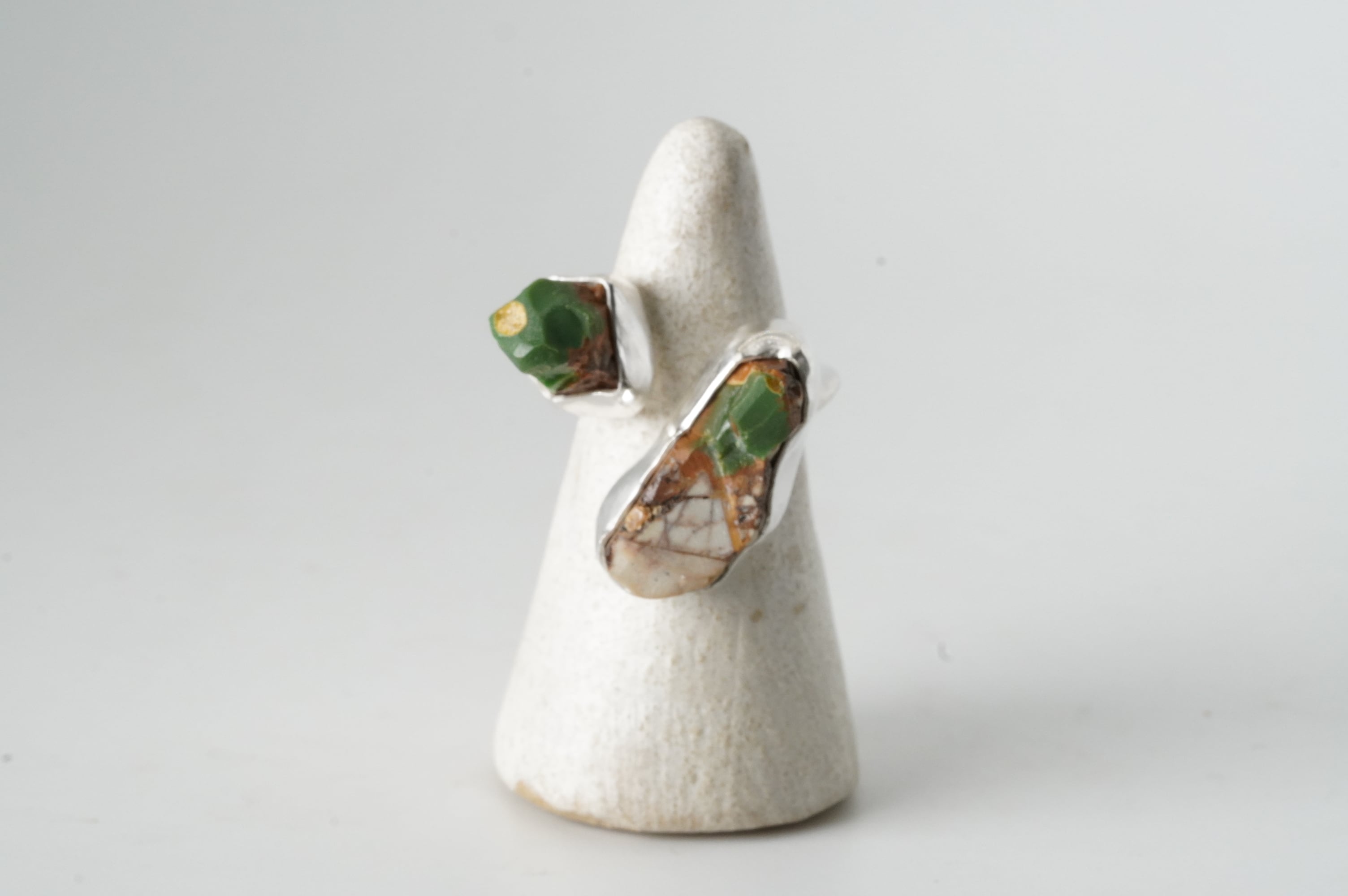 大きく突き出した深いグリーンの原石が愛らしいTwist ring。