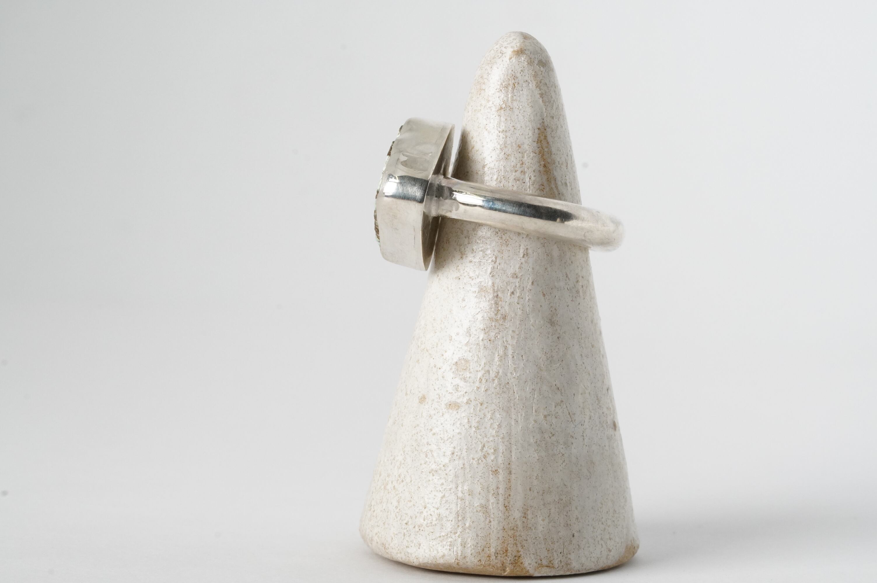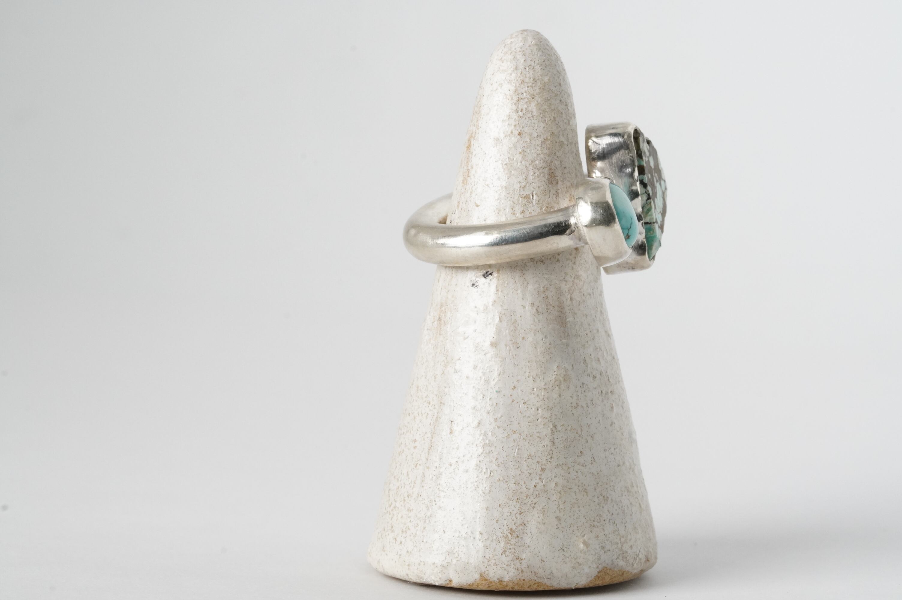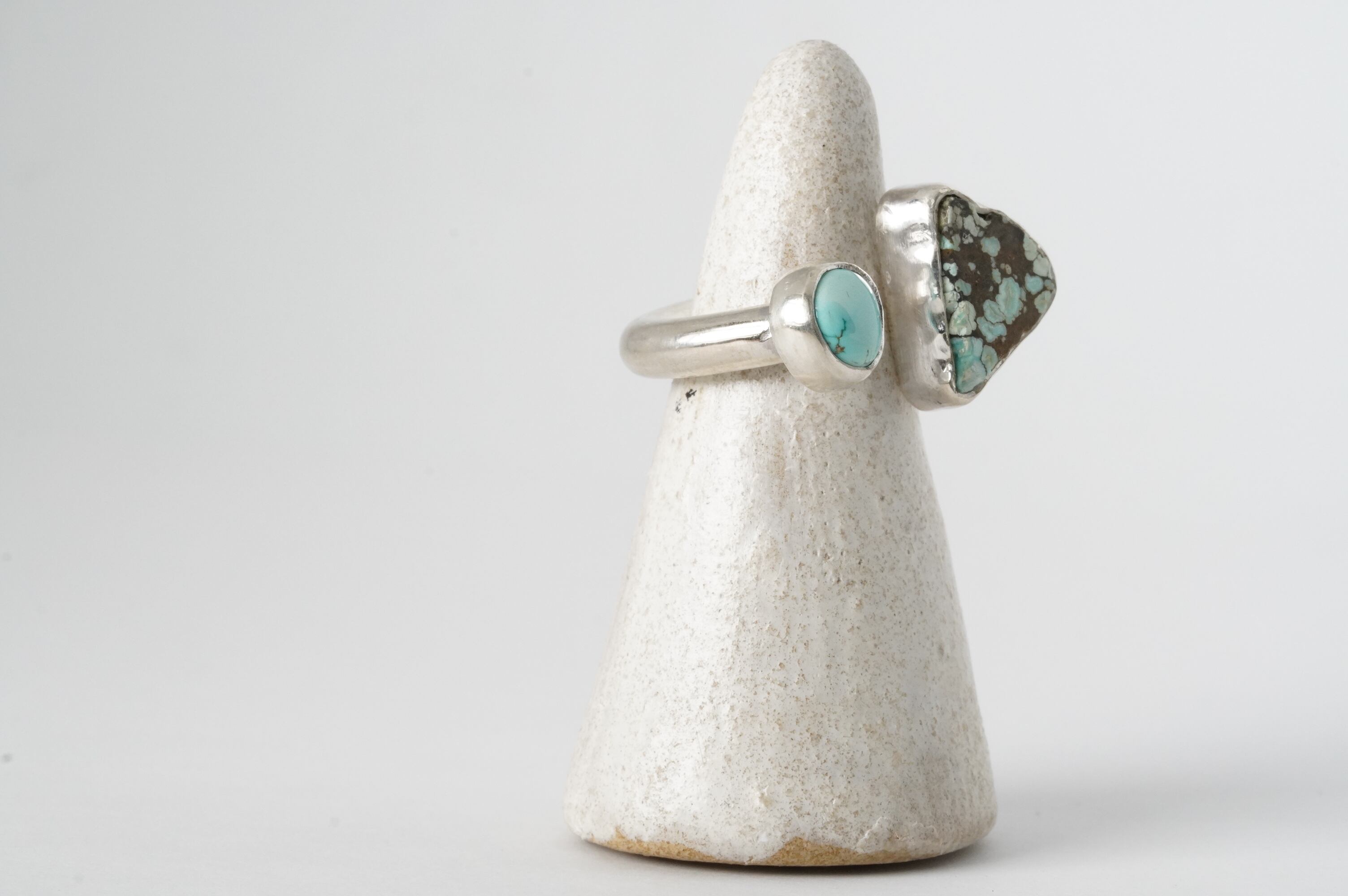 三角形のNo8の原石と薄いミントブルーが特徴的なドライクリークのルースを、ぷっくりと厚みのあるラウンドのシルバーで繋ぎ合わせTsugai ringにしました。