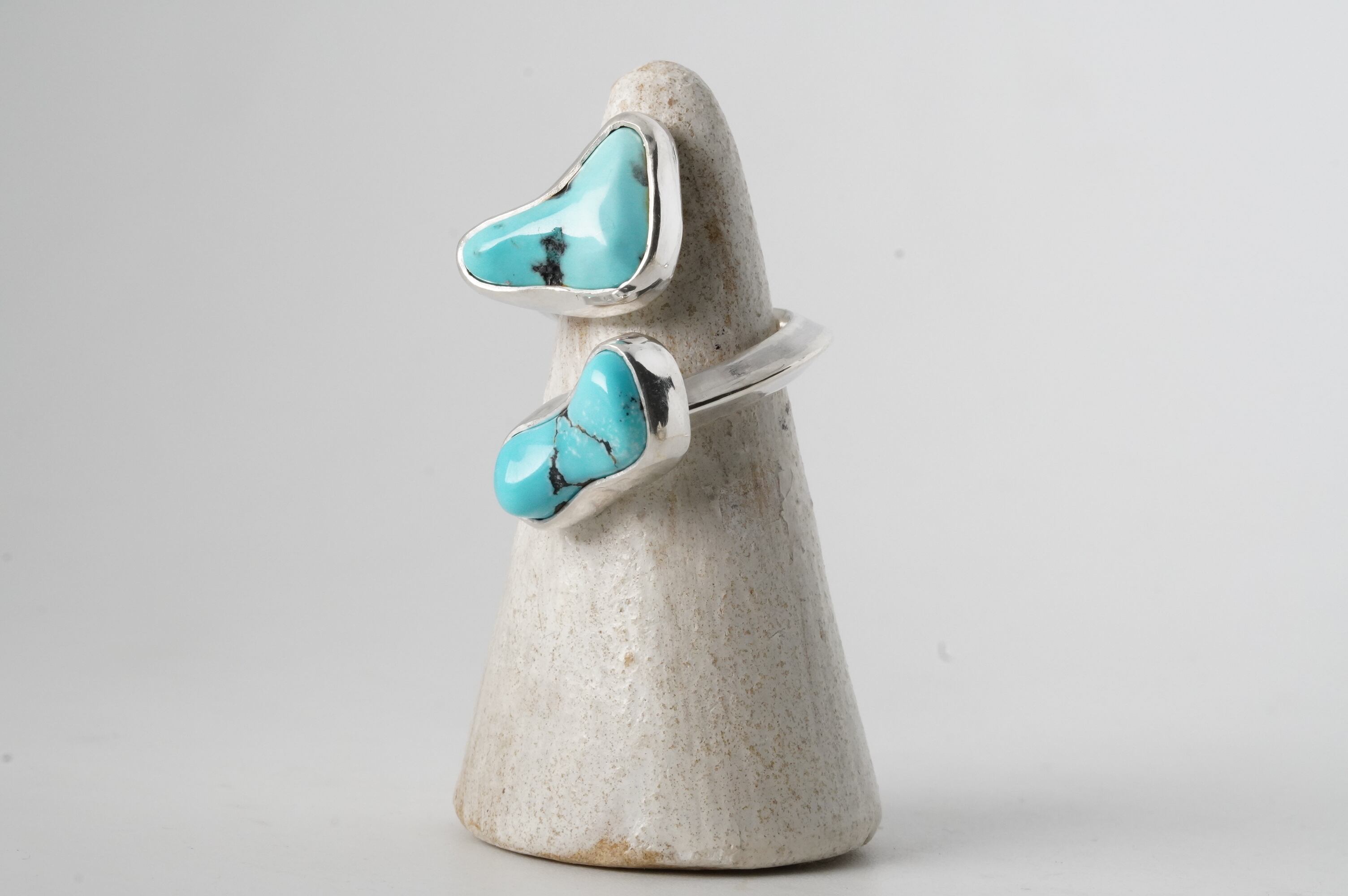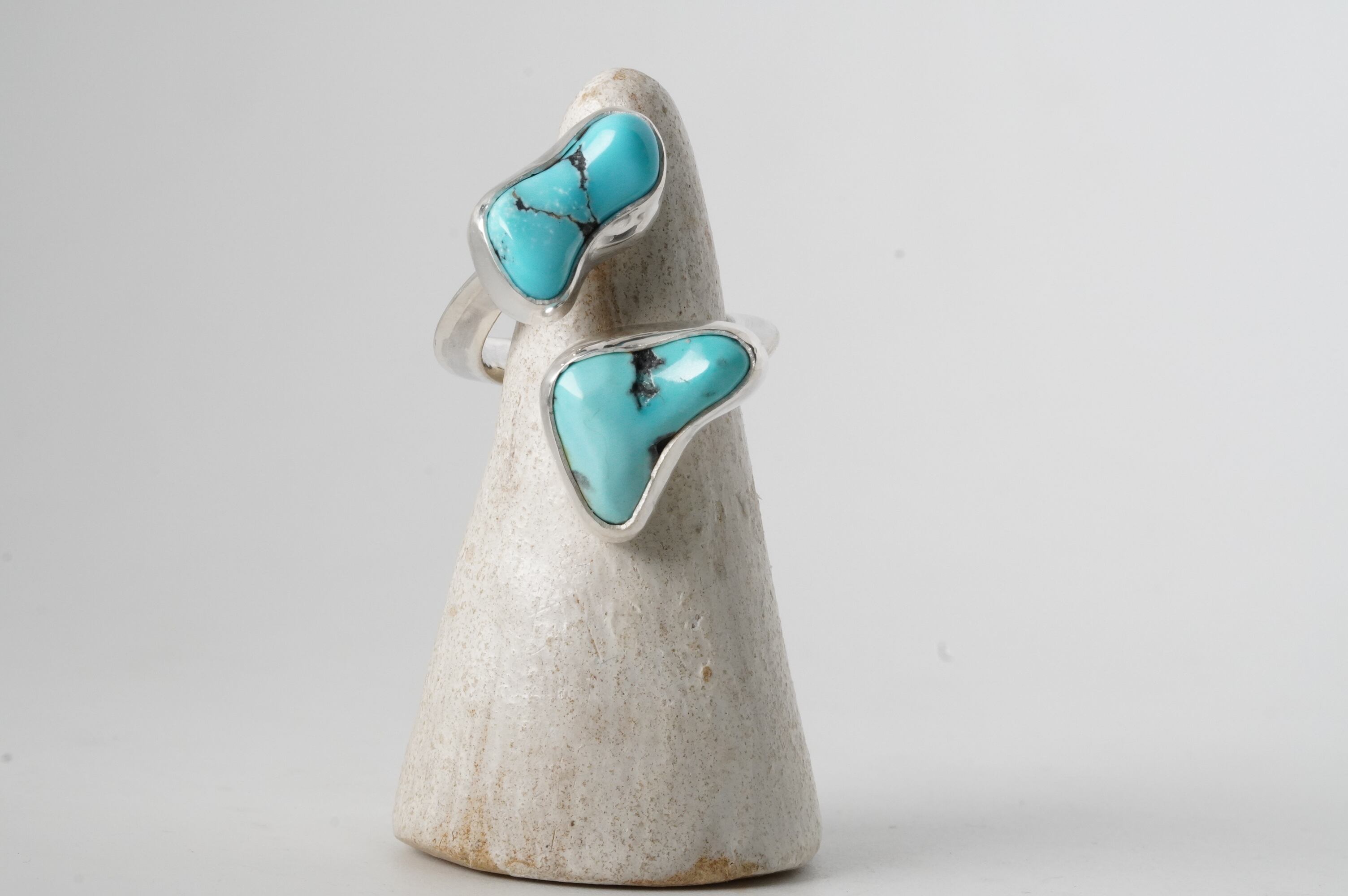 形成することなく自然の形のまま、なんとなくハート型に見える。 そんな石を斜めに並べました。 ハッキリしたハート型は、大人には少し甘すぎる。 一見すると鳥のようにも見える密かな甘さ Kingman turquoise Silver925 純銀
