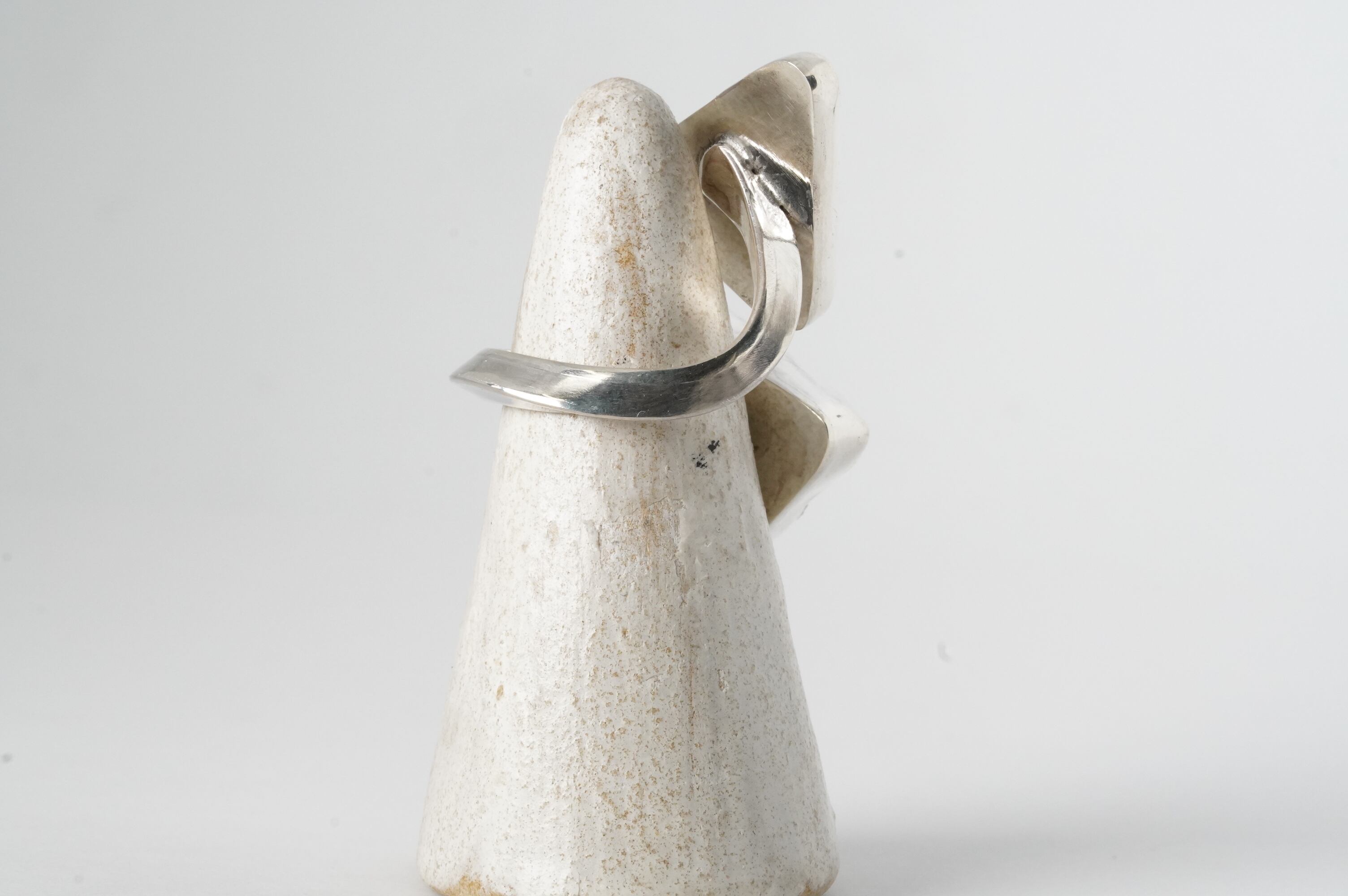 三角のオニキスと黒い切り絵を貼ったようなホワイトバッファローの原石を三角のシルバーで斜めに繋ぎtwist ringにしました。