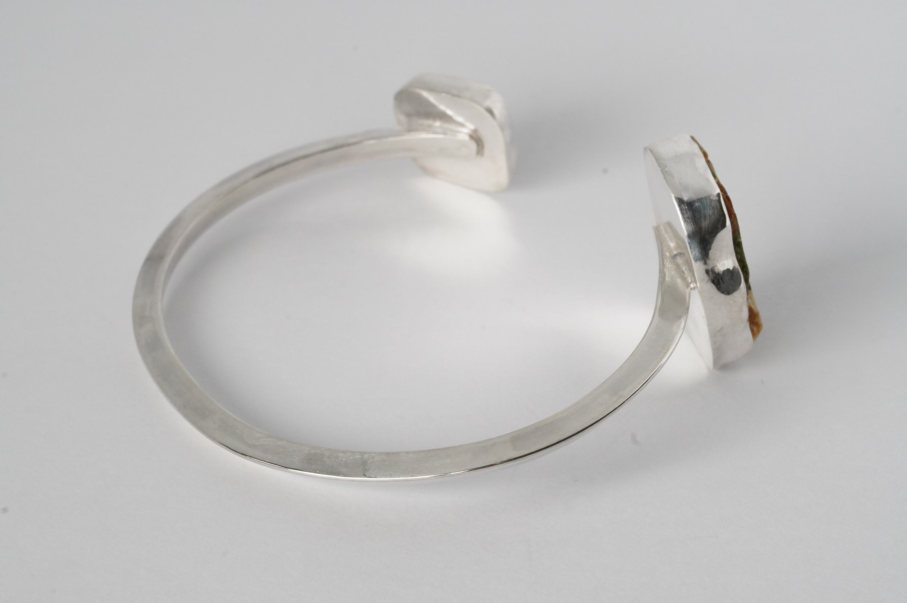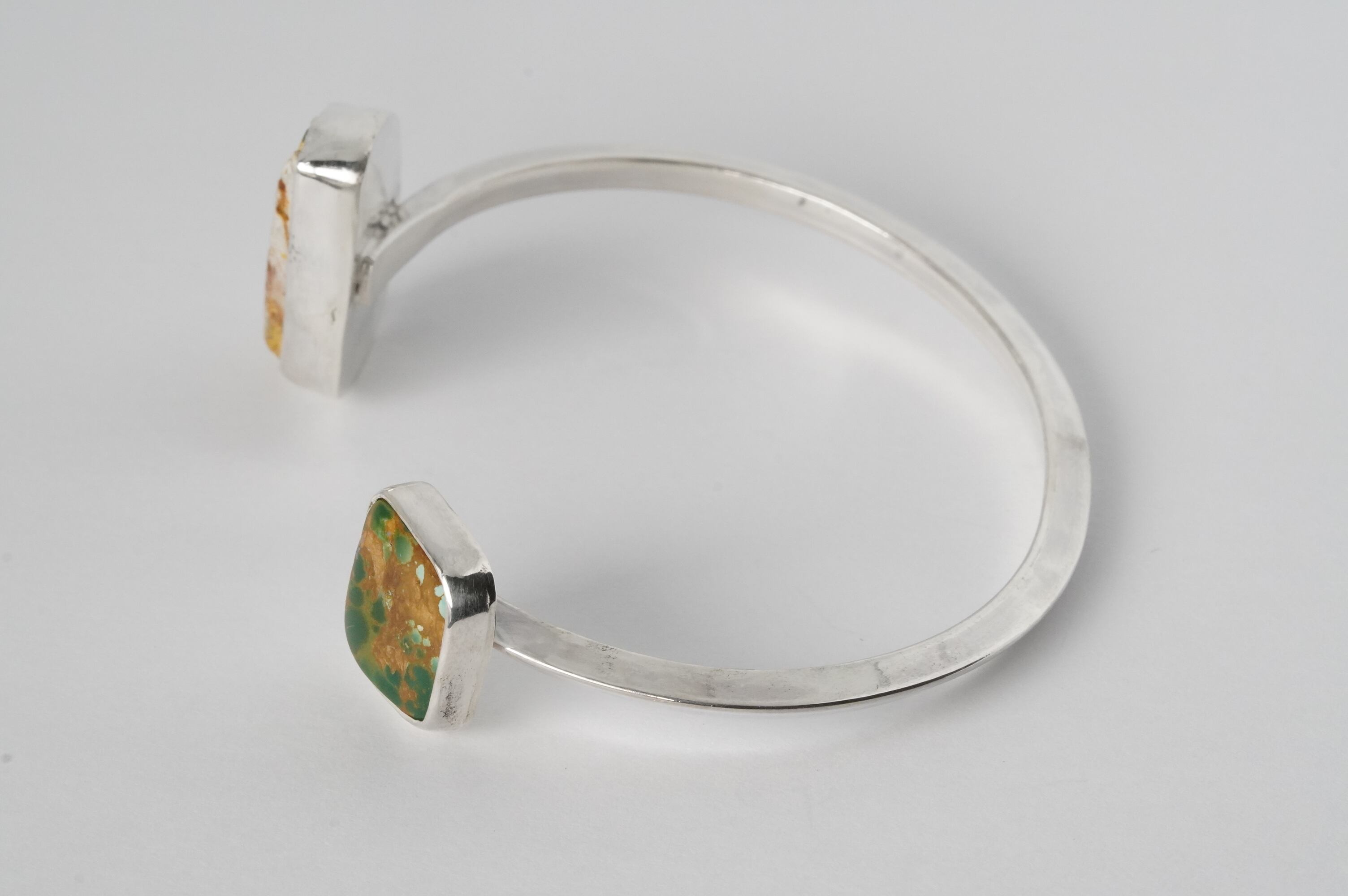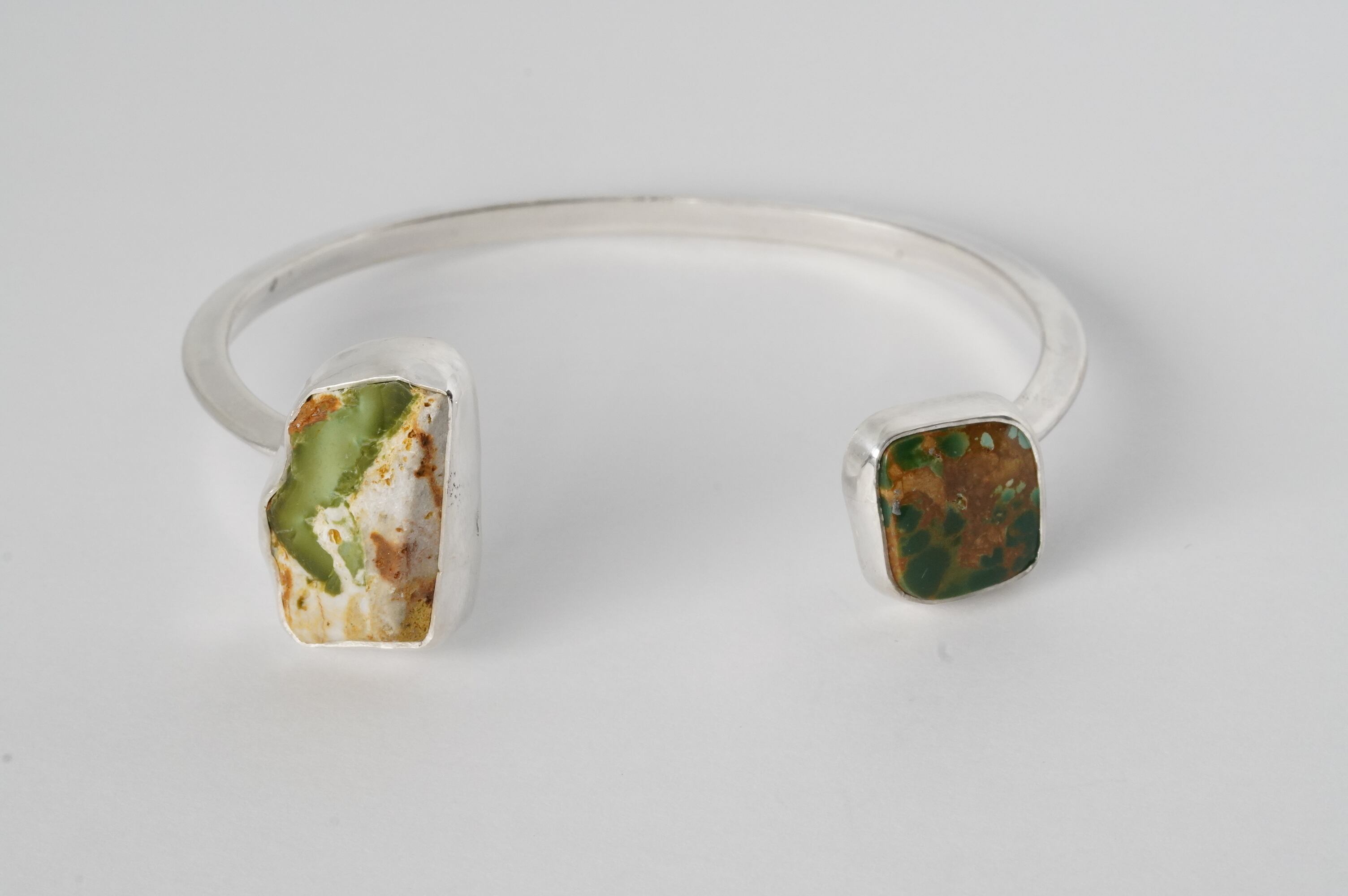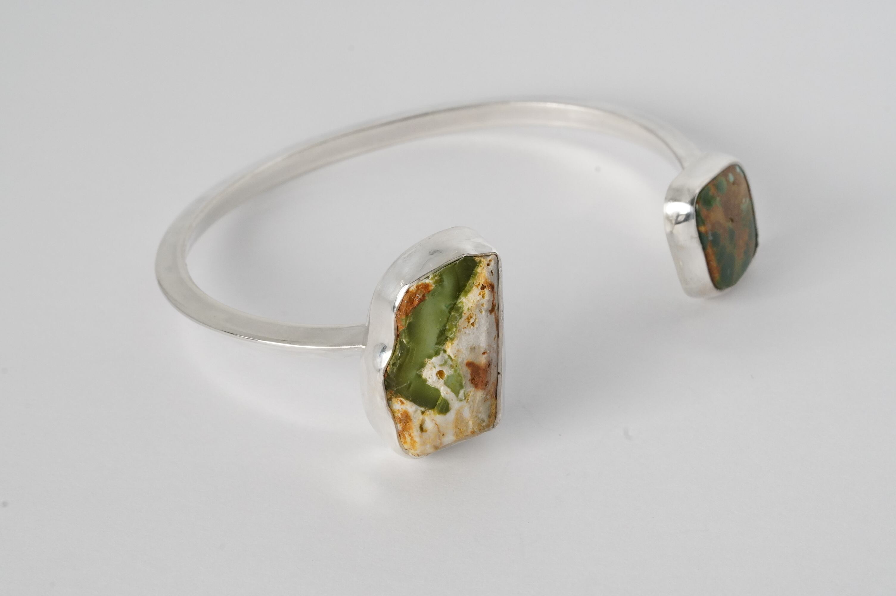 石を削り出した彫刻作品のようなターコイズの原石に紅葉が始まる秋の景色のようなブラウンと緑が美しく入り混じるルースをTsugai Bangleにしました。