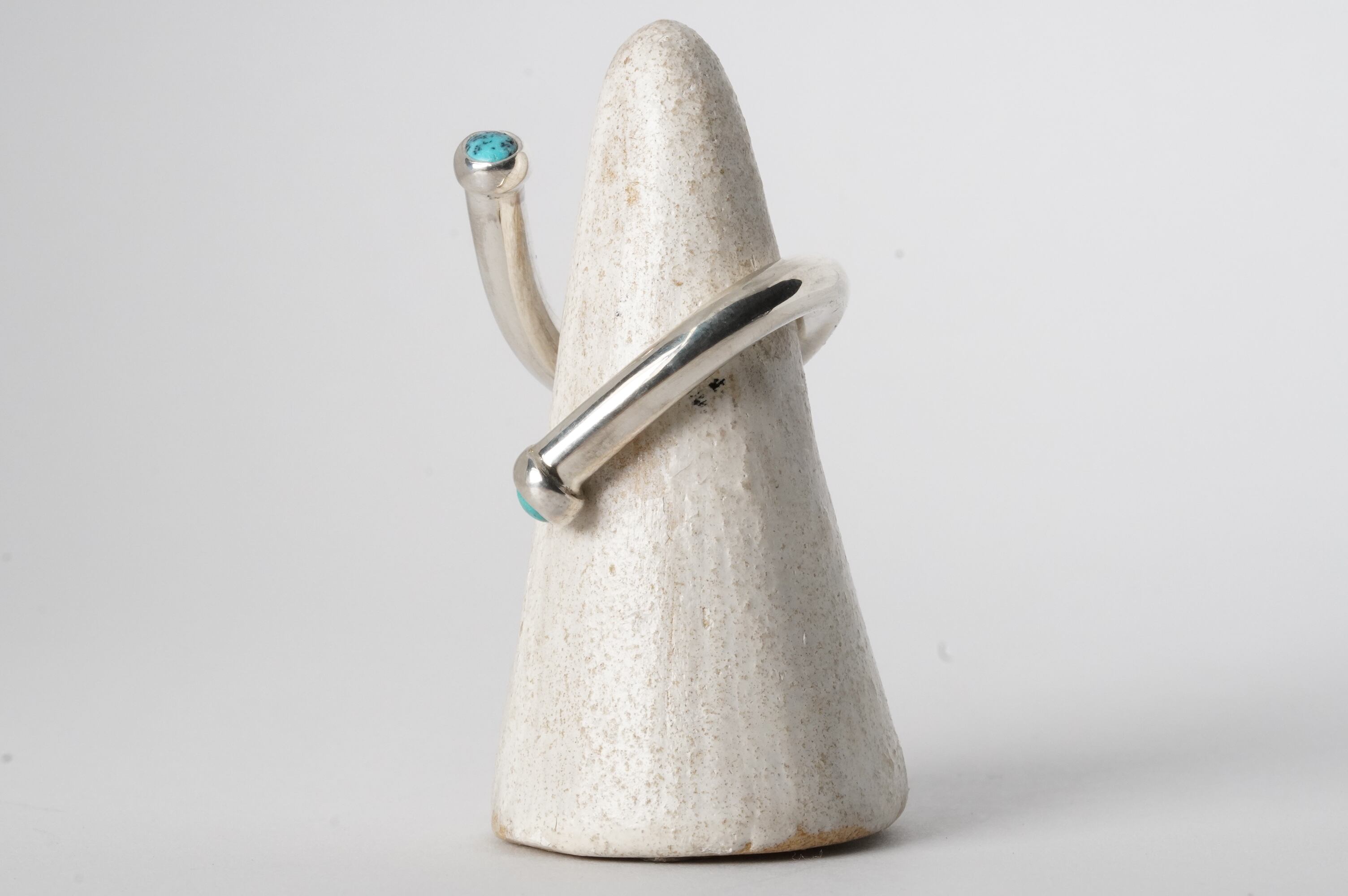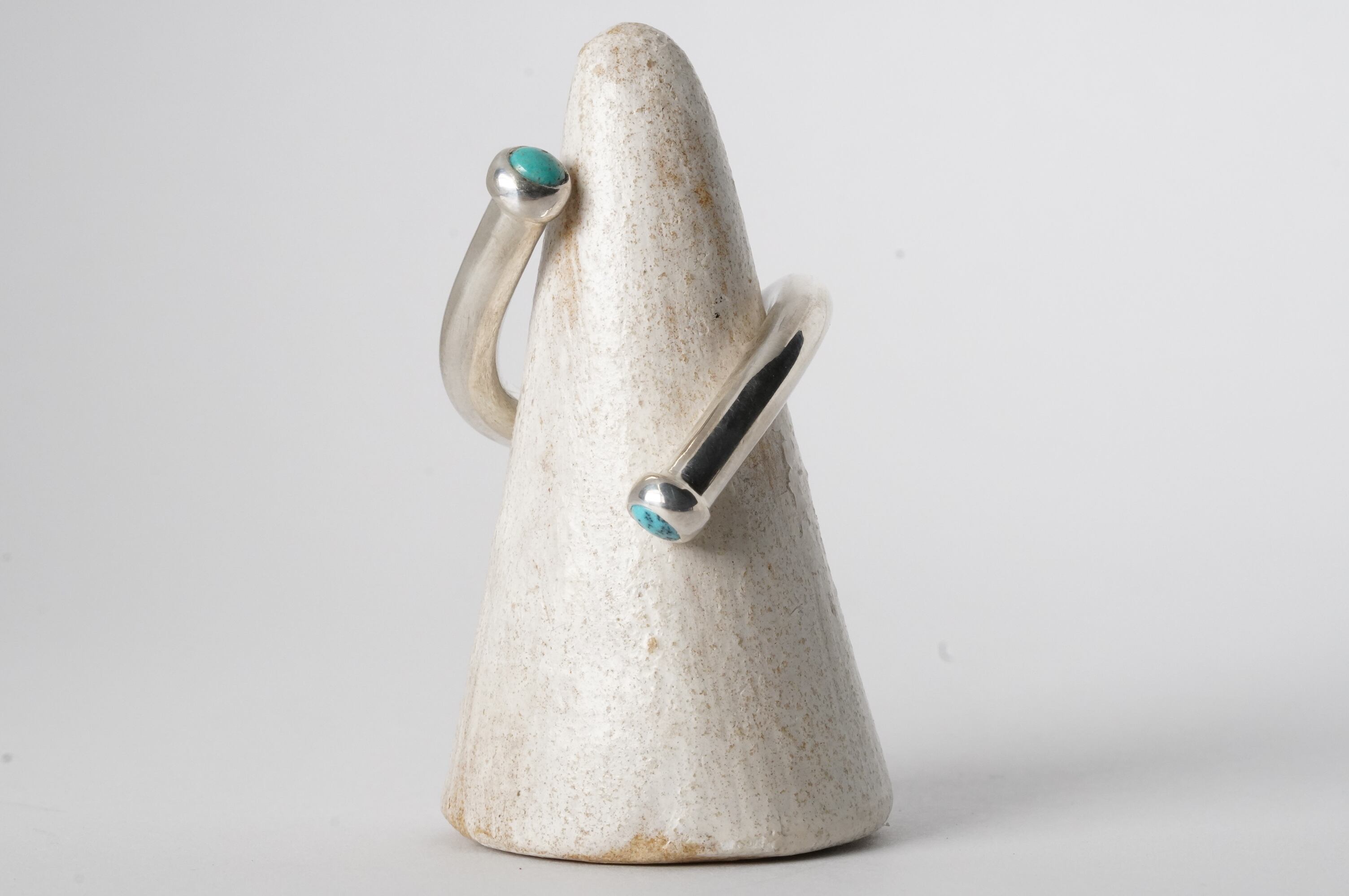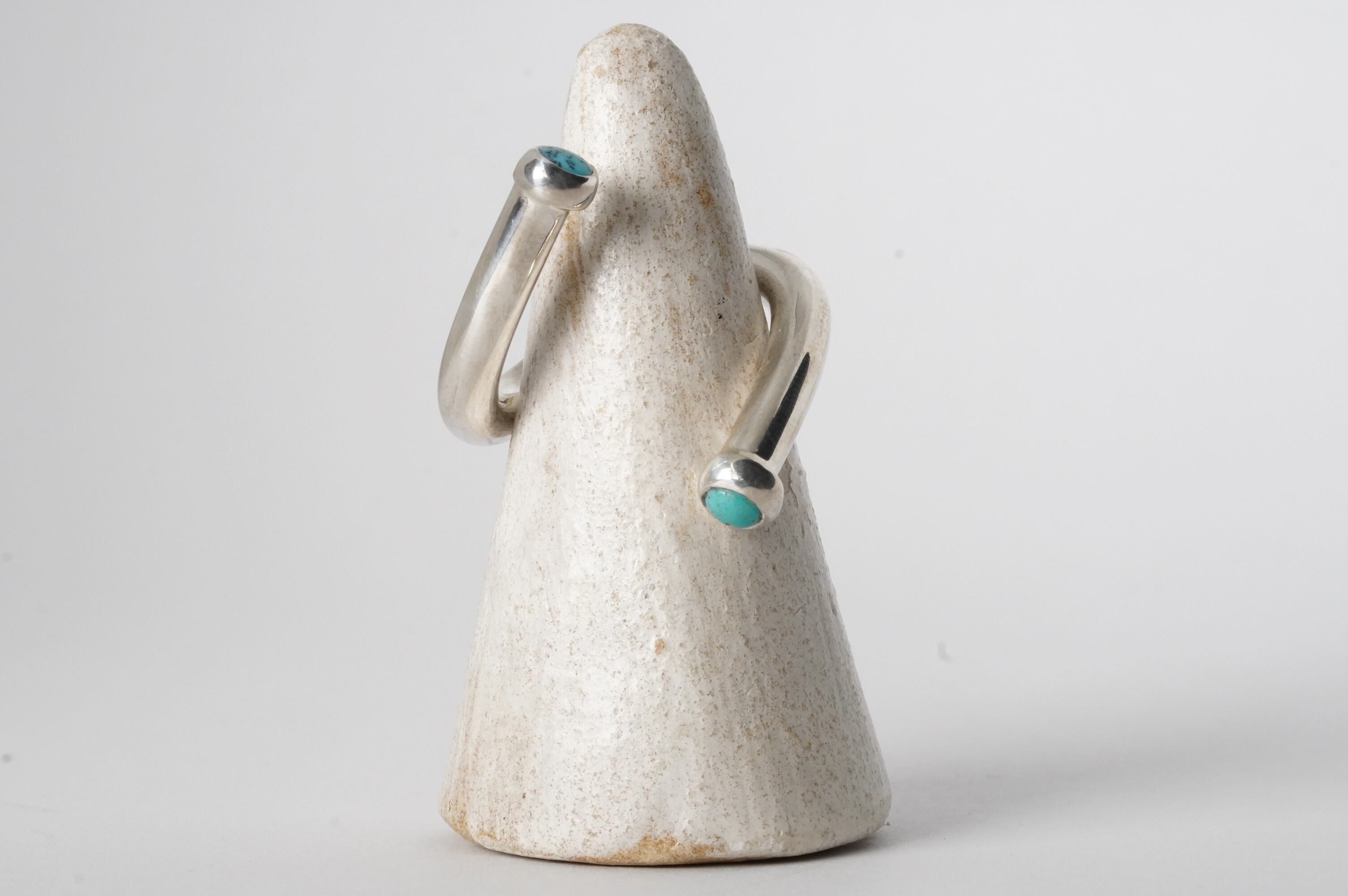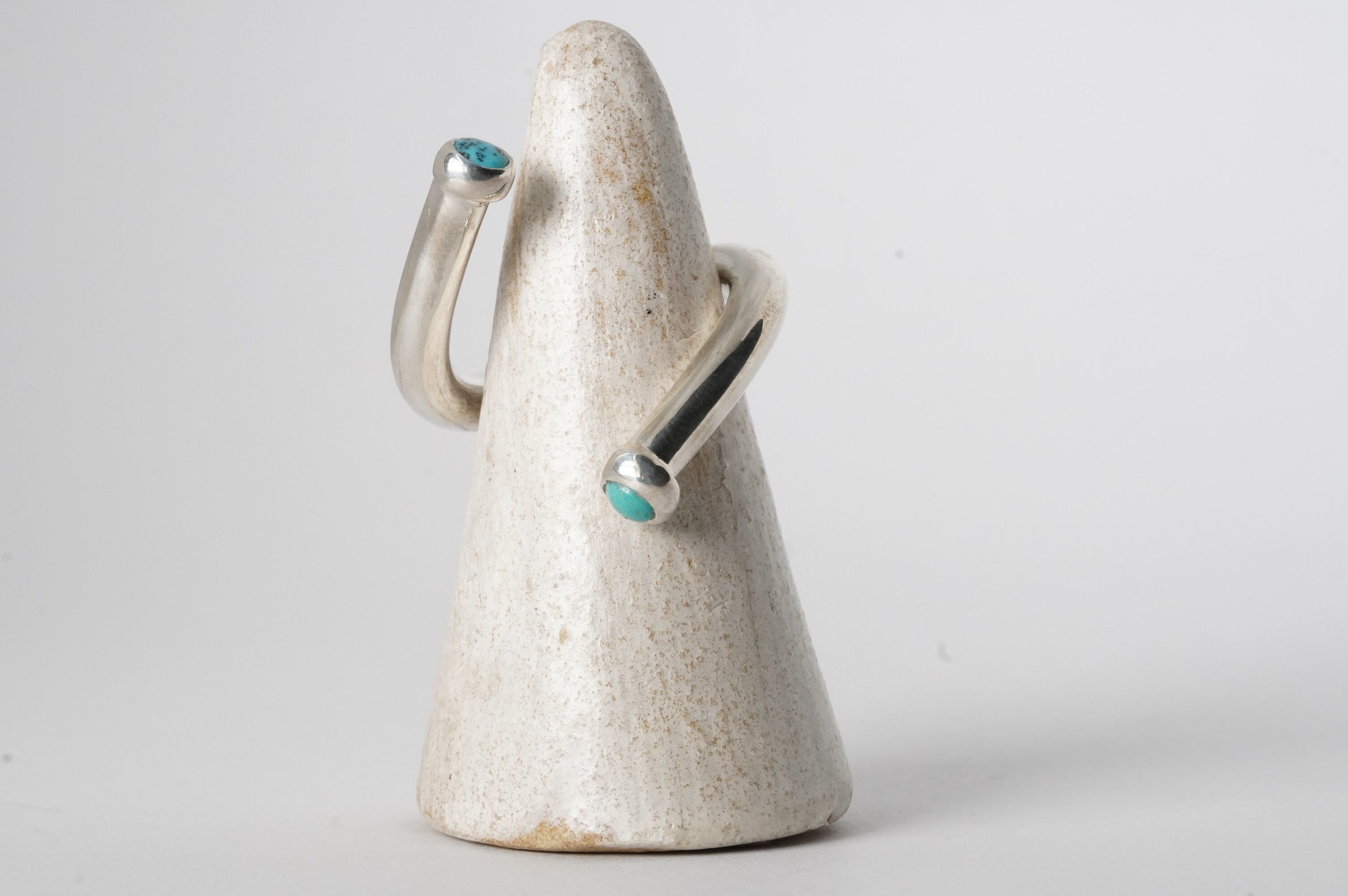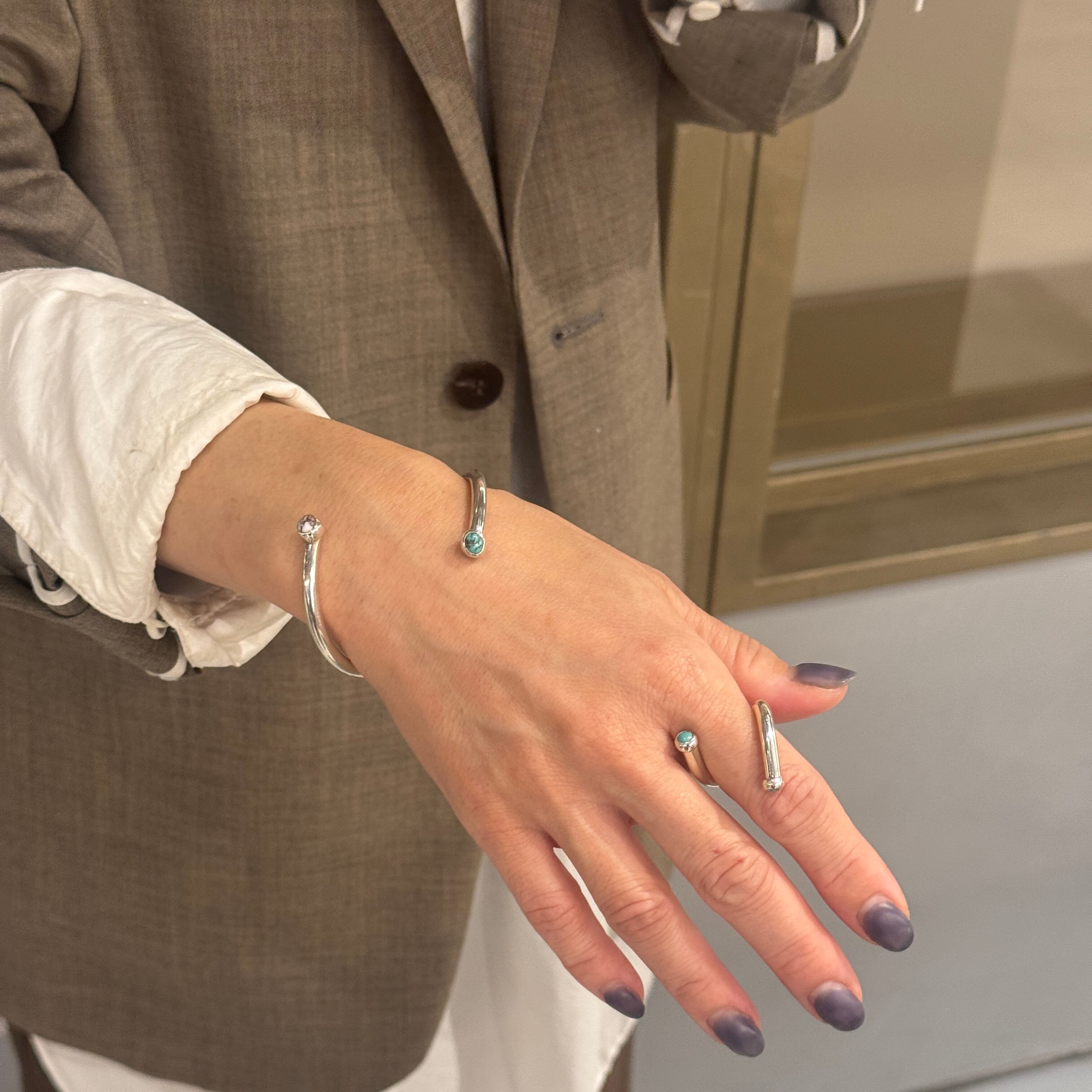 シルバーの先端には小さなroystoneのややエメラルドグリーンのターコイズとブラックの斑点がアクセントの濃いブルーのkingman turquoiseをそれぞれ埋め込むように付けました。上下は付け替えるだけで印象も変わるので飽きのこない作品。