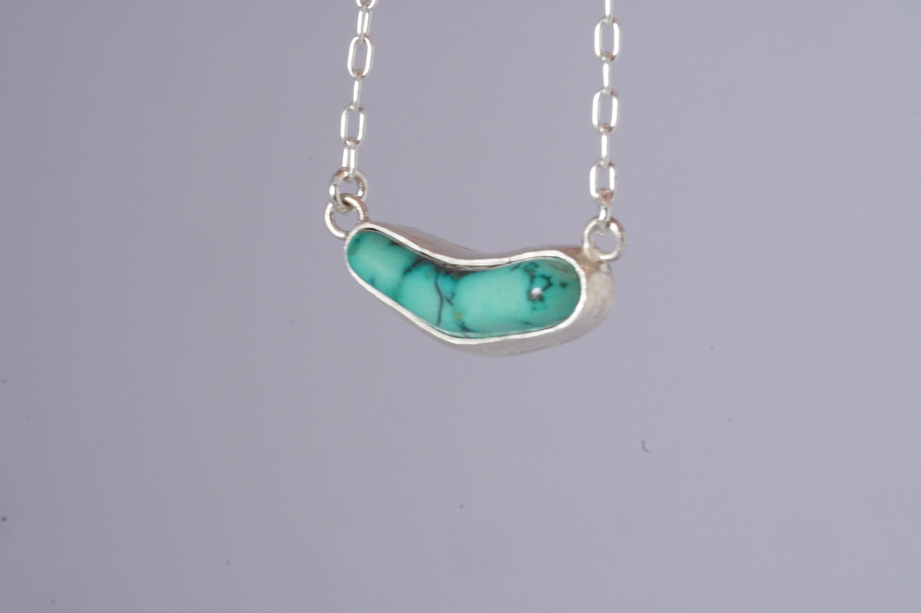バナナのような可愛らしく厚みのある形のターコイズをチェーンとセットで作りました。