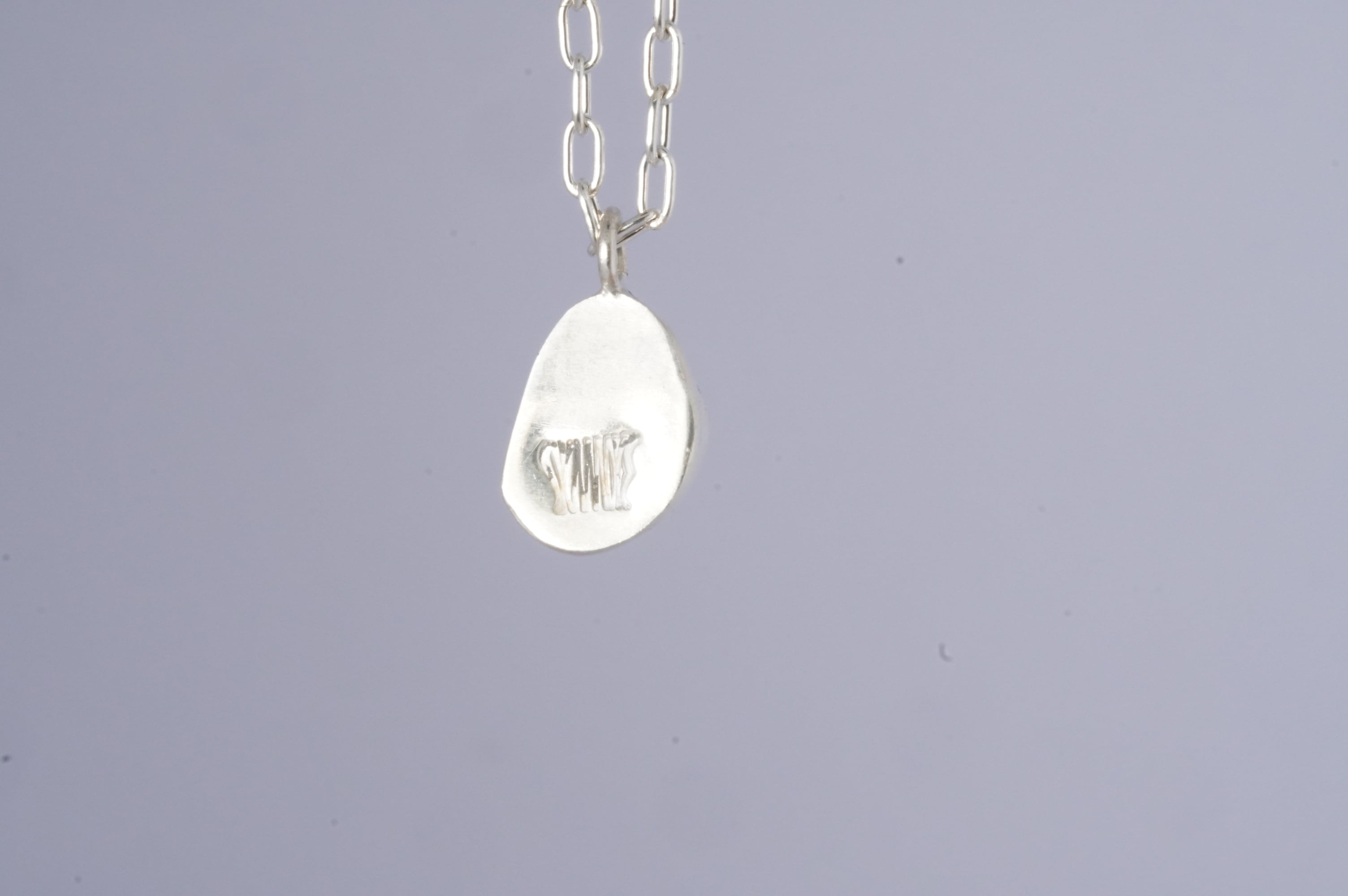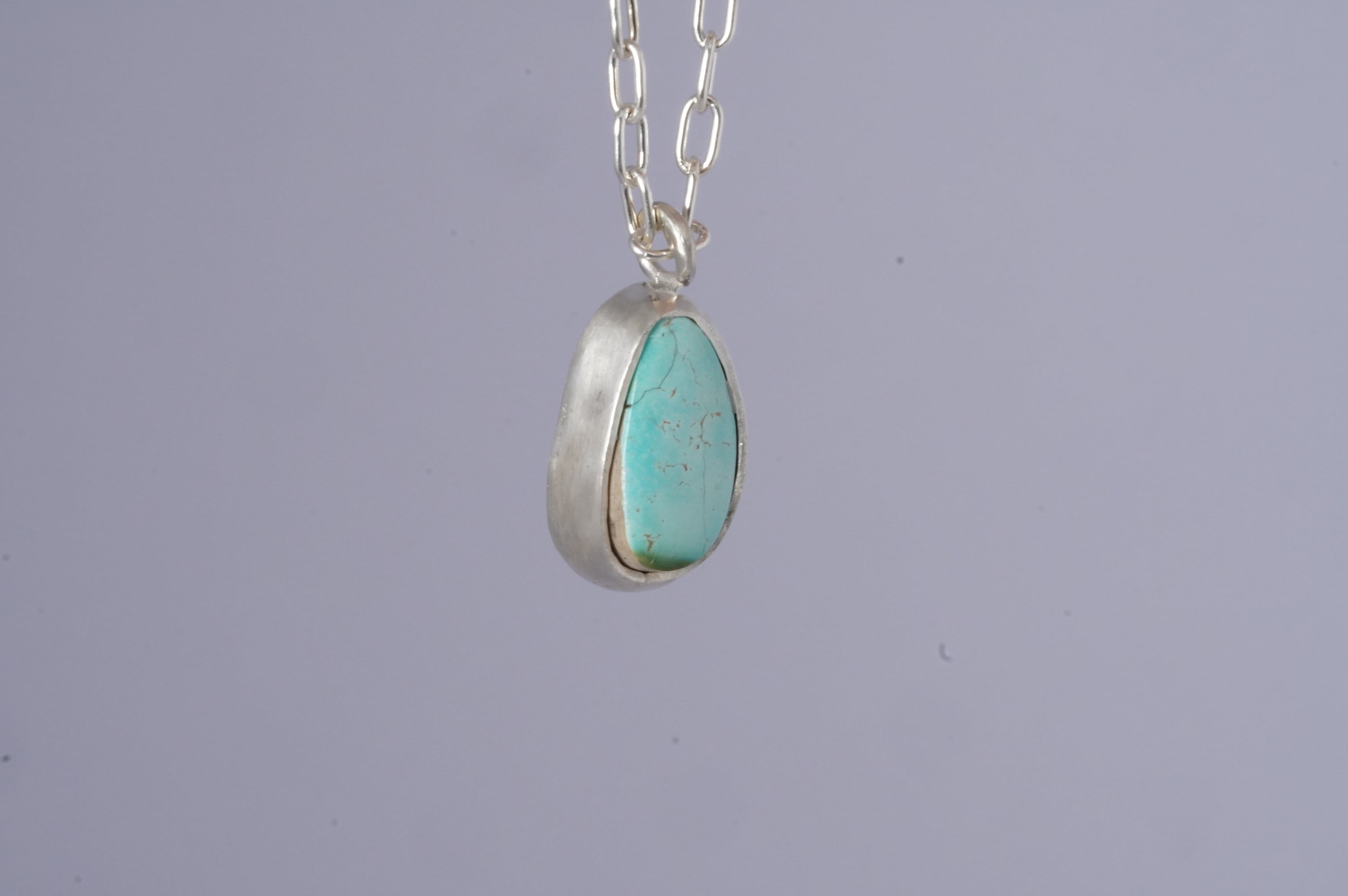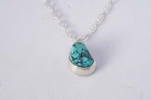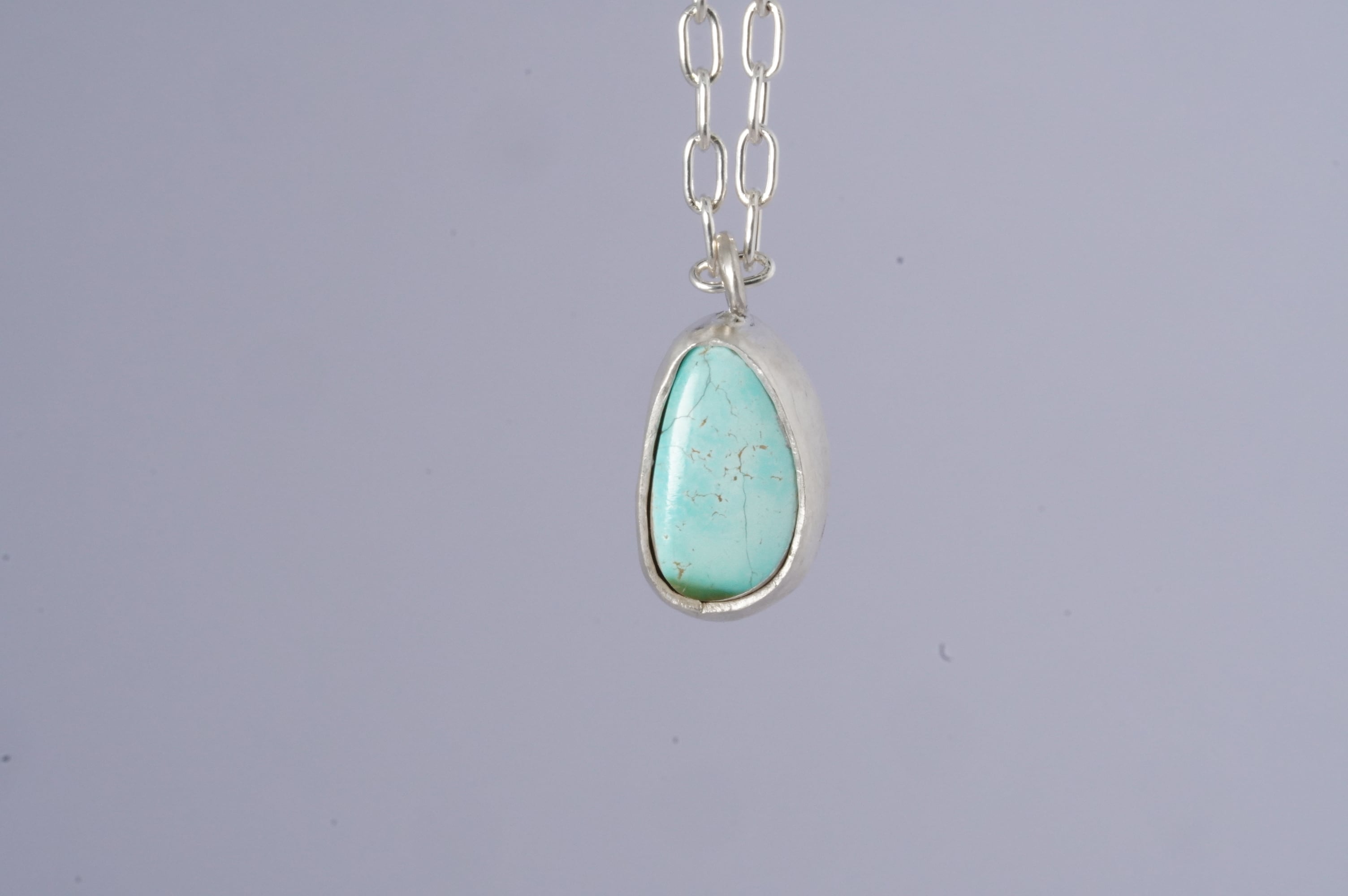 ドロップ型で厚みのある薄いミントブルーが爽やかな小粒のターコイズをチェーンとセットでペンダントトップに仕立てました。