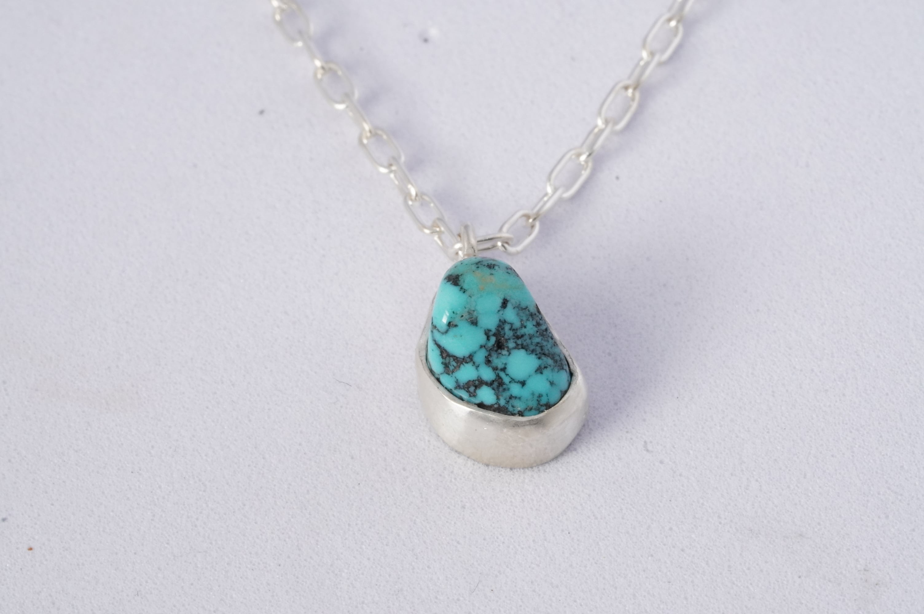小粒ながらもポコっと大きく前に突き出した凹凸のあるターコイズをチェーンとセットでペンダントにしました。