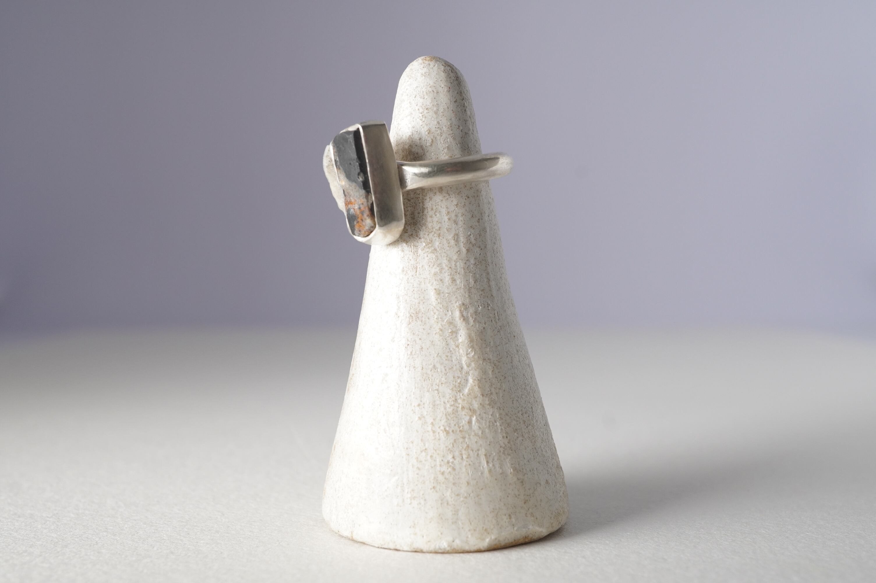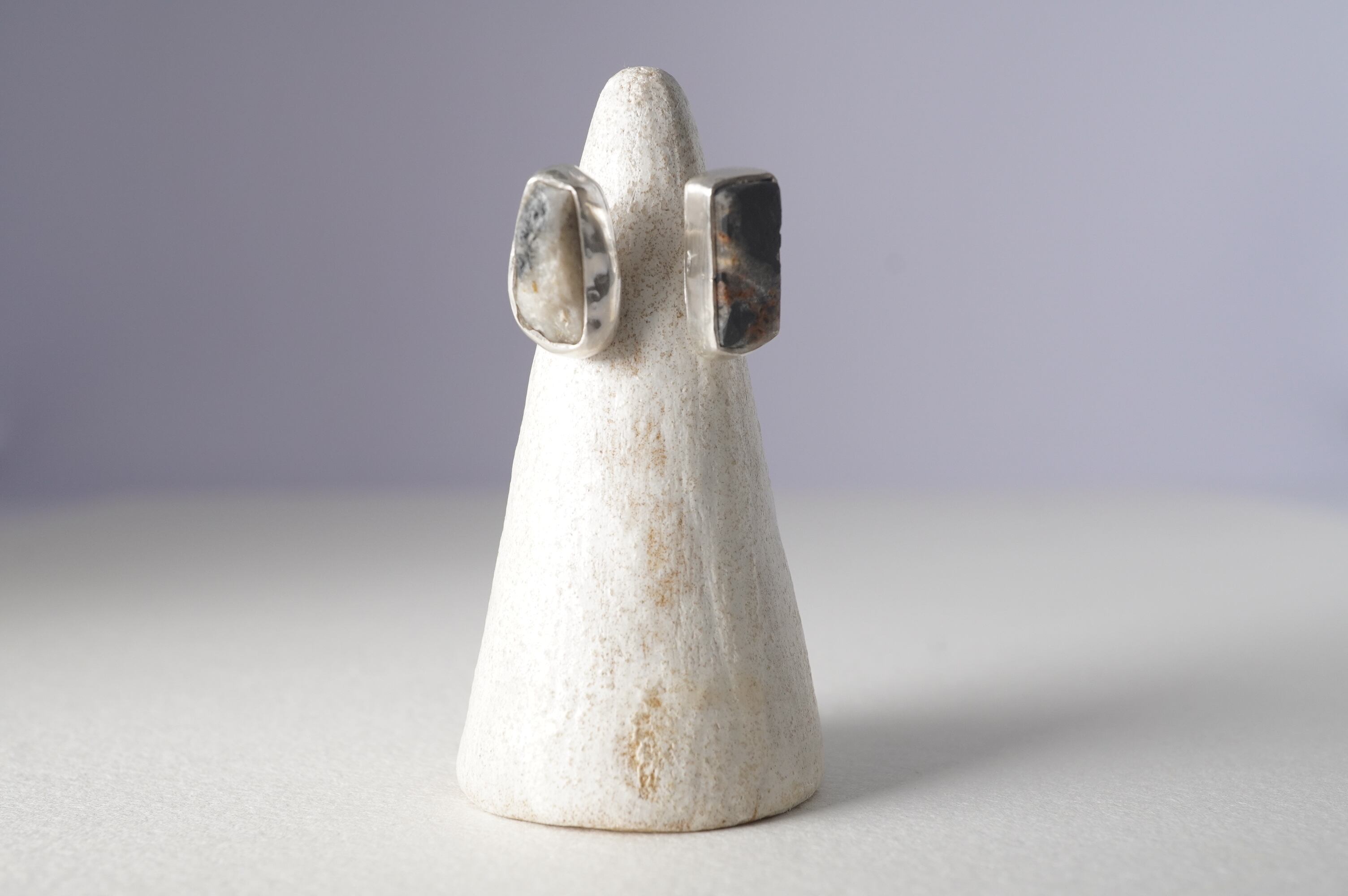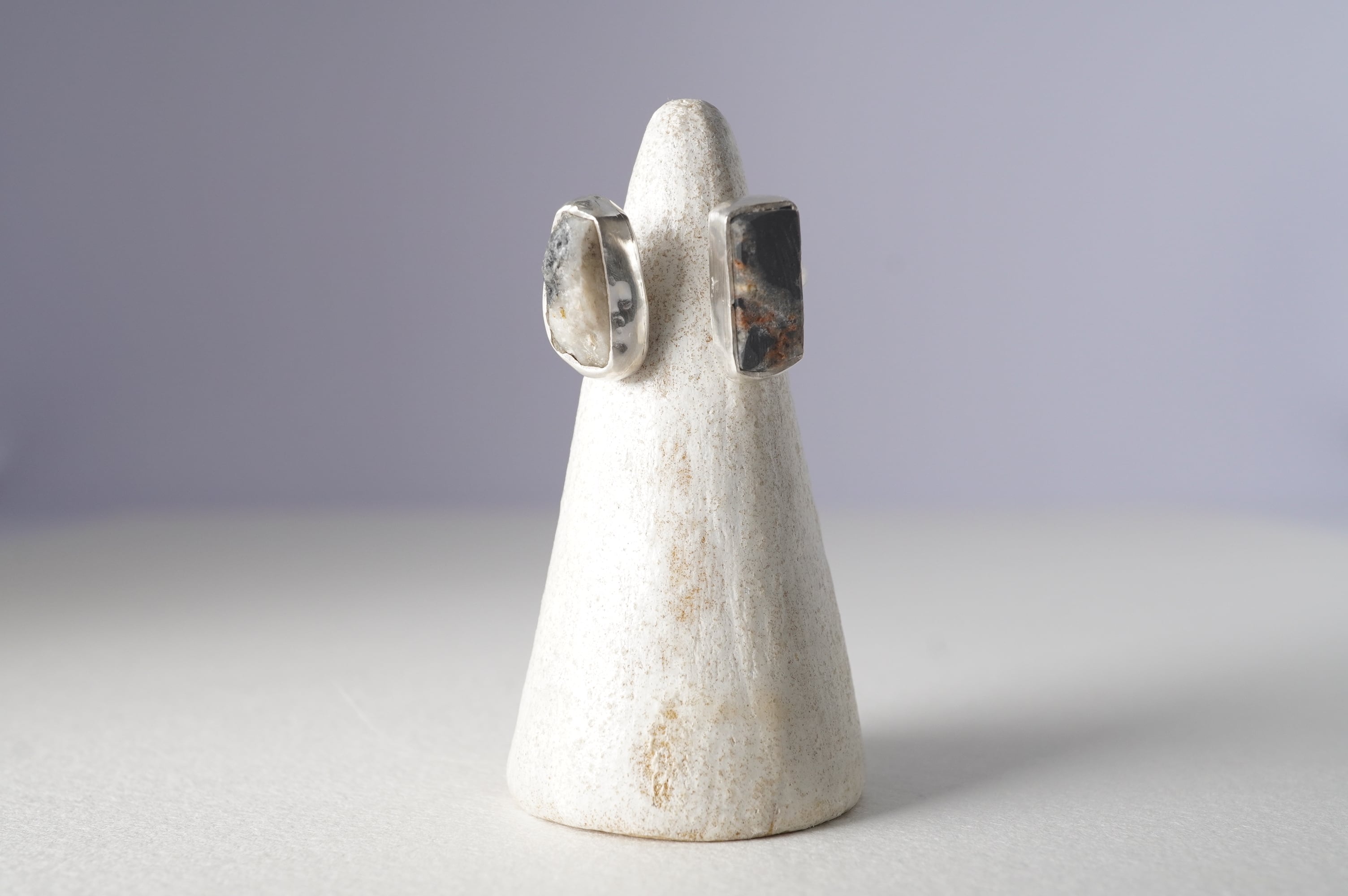 白が多いWhite Buffaloらしい原石の小さなかけらと、黒が主体の茶やベージュが混じる四角いWhitebuffaloの原石を対象的に並べ華奢なPinky Ringにしました。