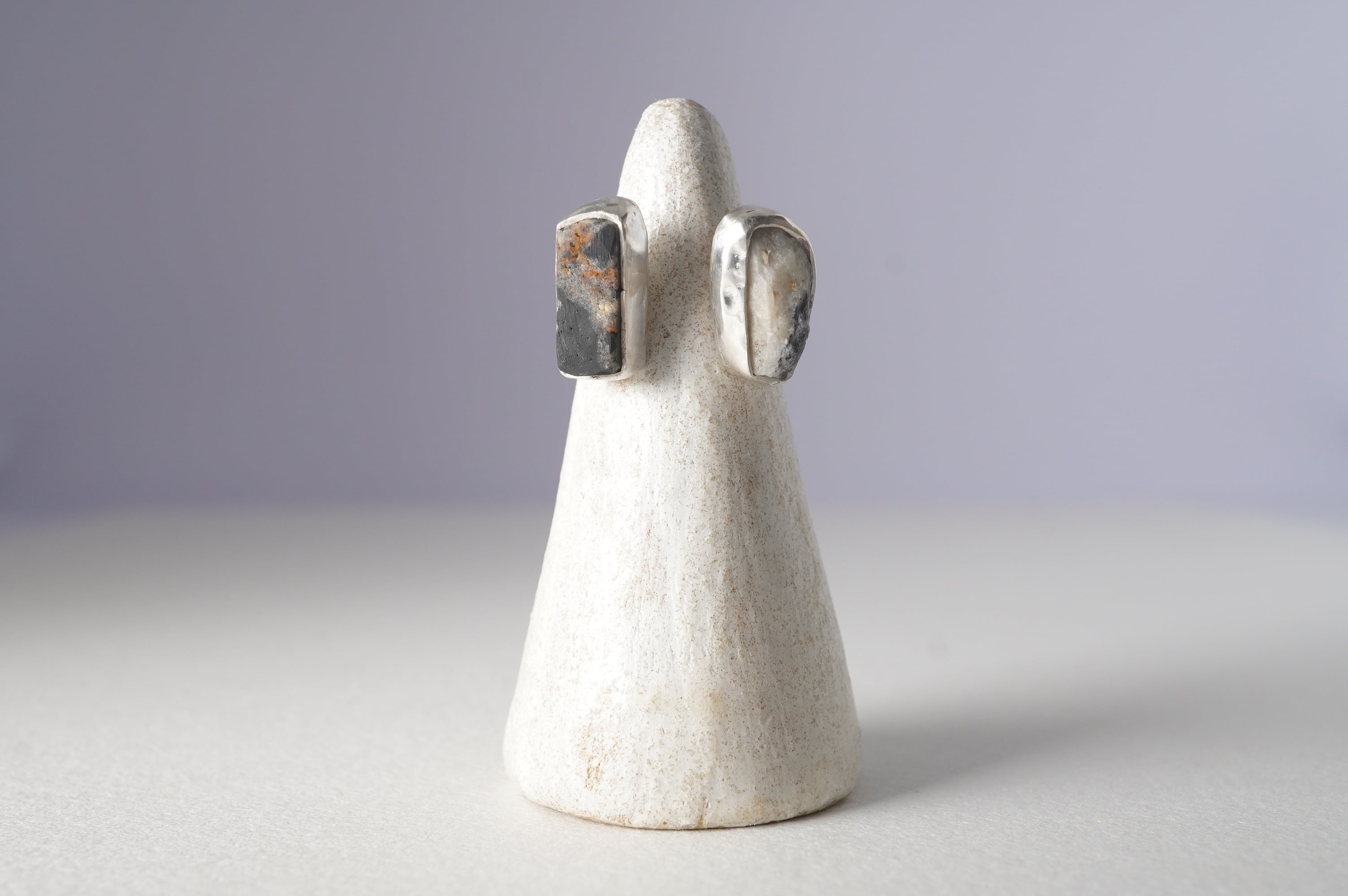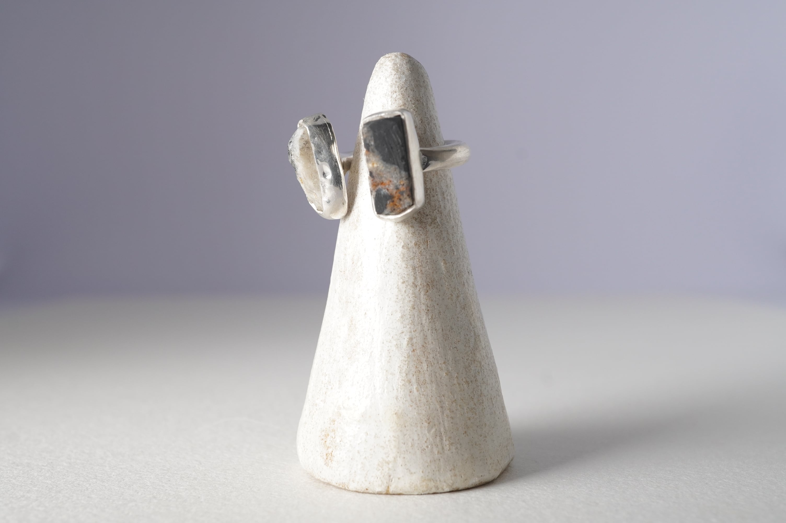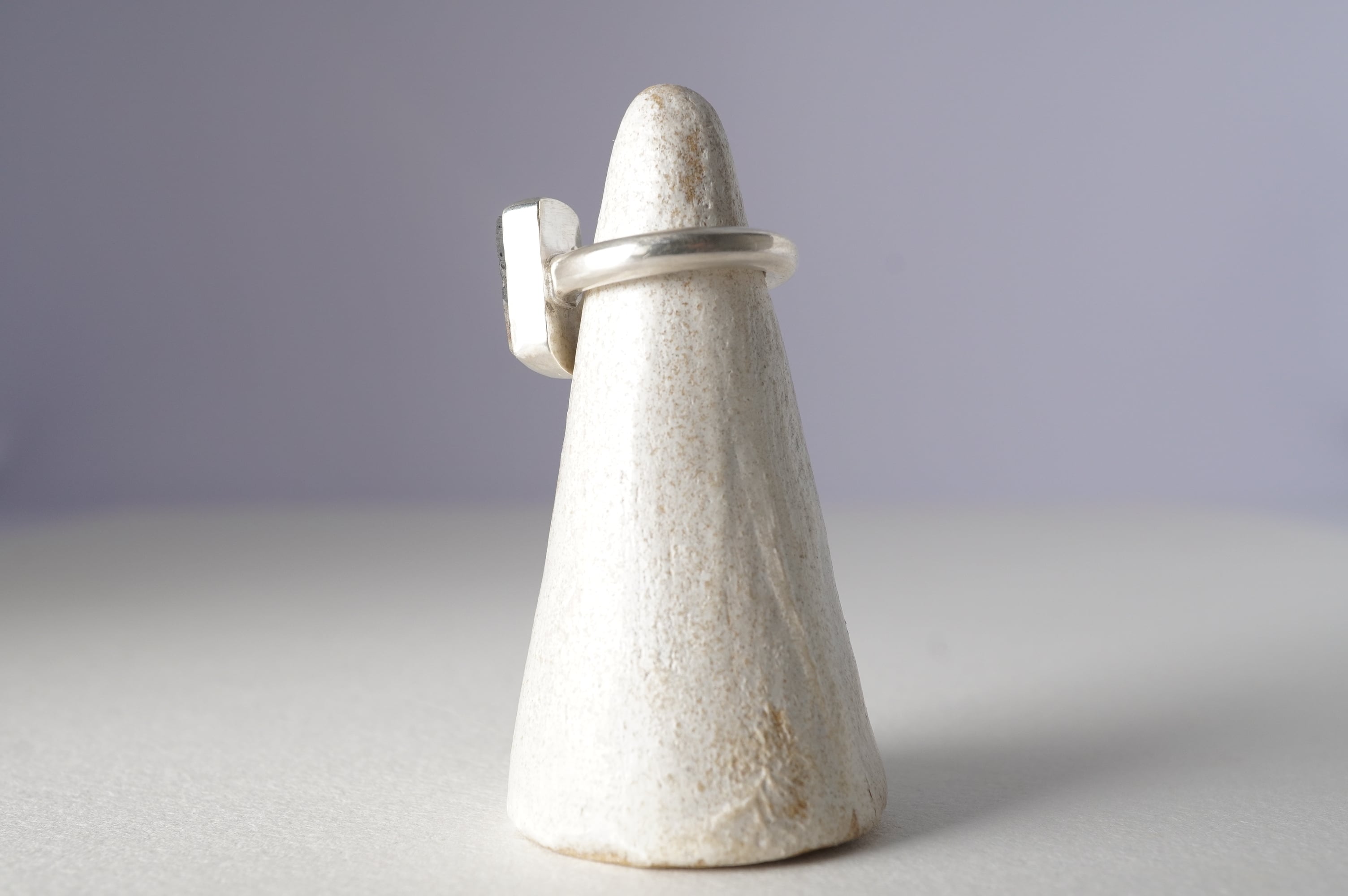 白が多いWhite Buffaloらしい原石の小さなかけらと、黒が主体の茶やベージュが混じる四角いWhitebuffaloの原石を対象的に並べ華奢なPinky Ringにしました。