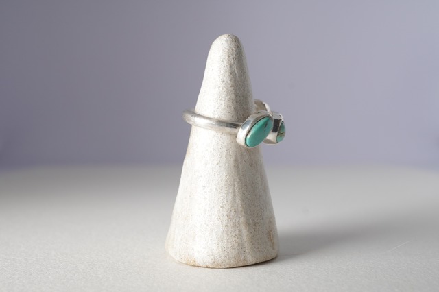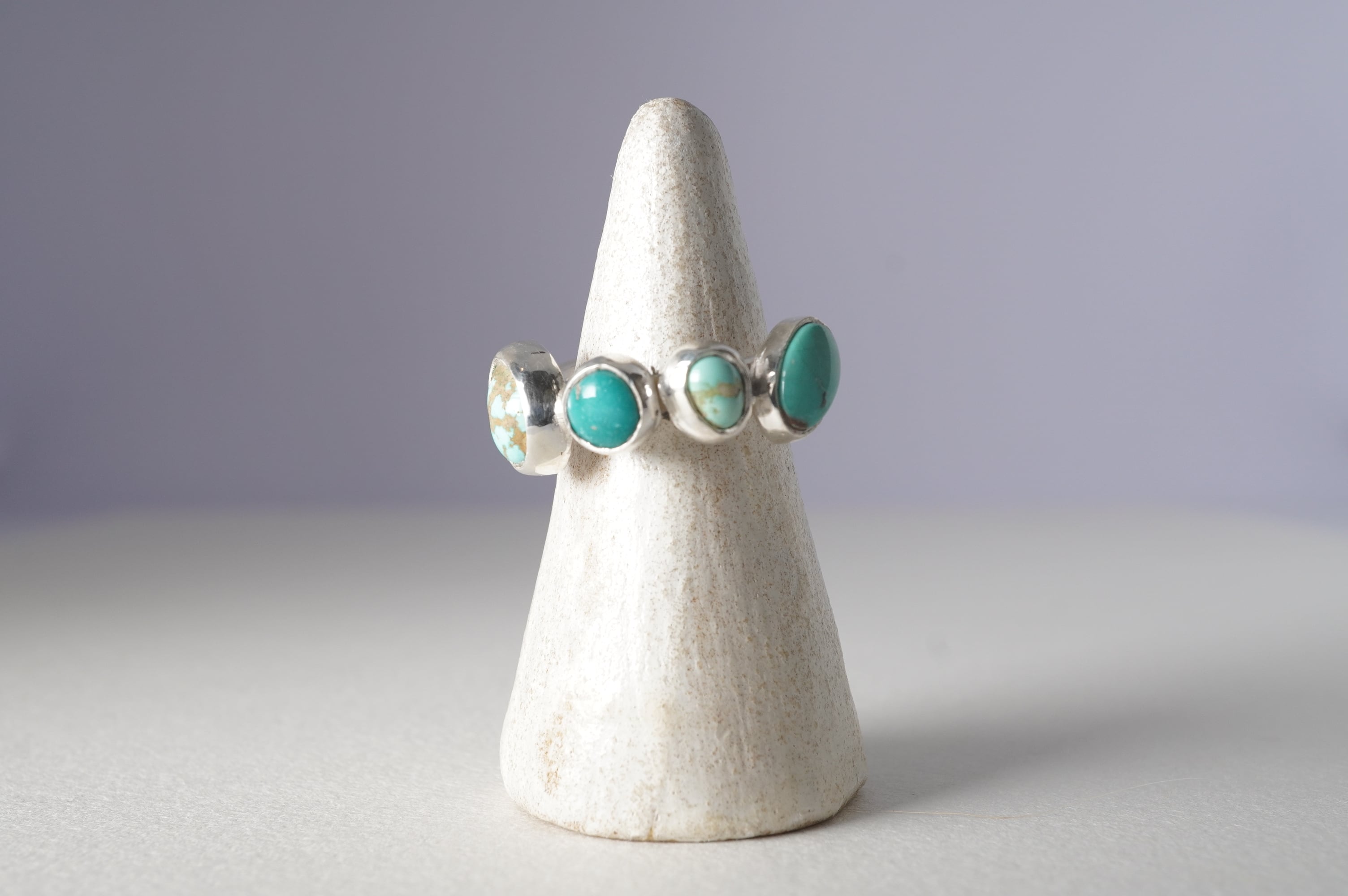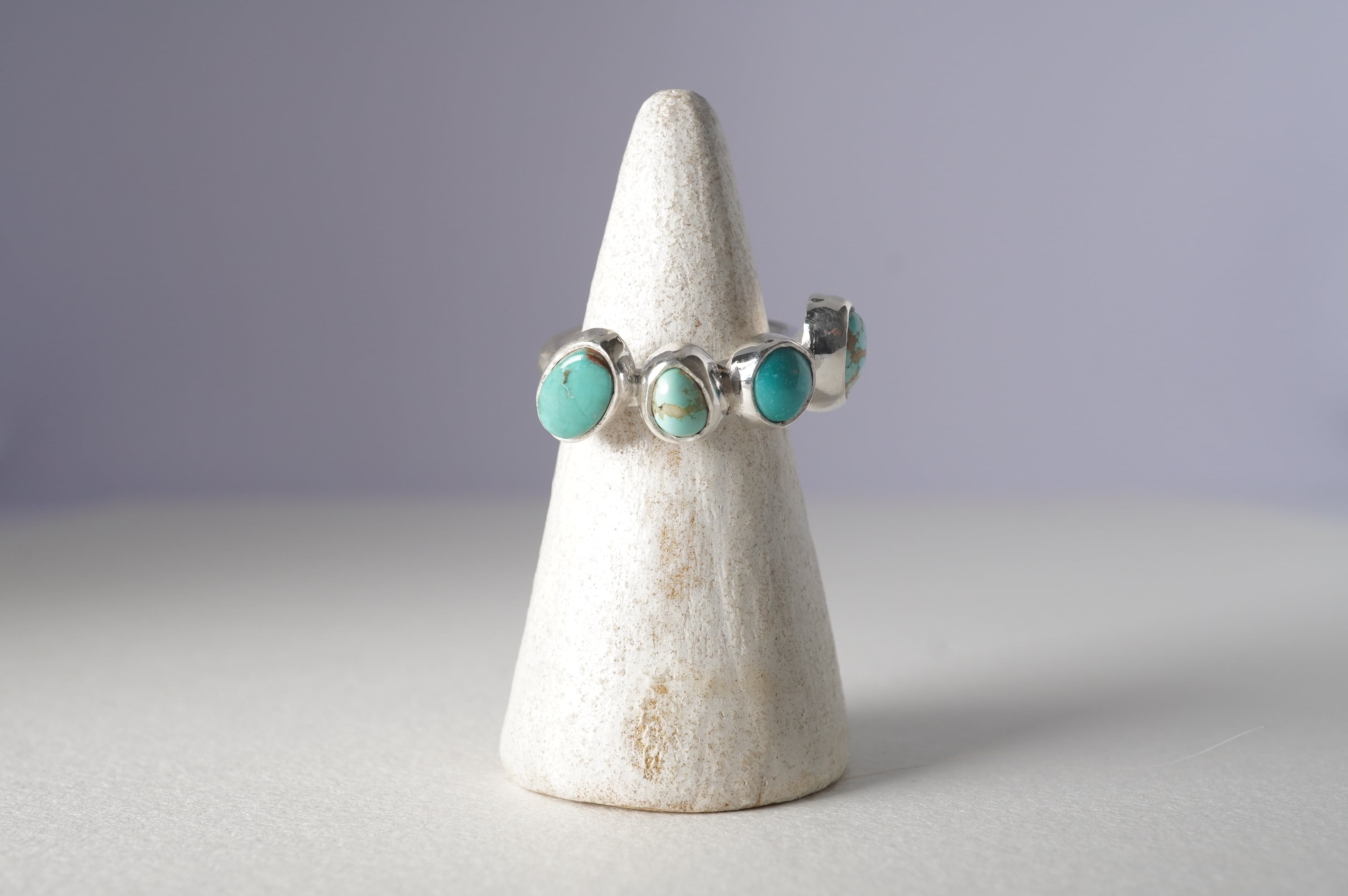 4つの鉱山も色も形もが異なる turquoiseのルースを、角度も変えてバラバラに並べて花冠のようなリ不揃いで愛らしいリングにしました。