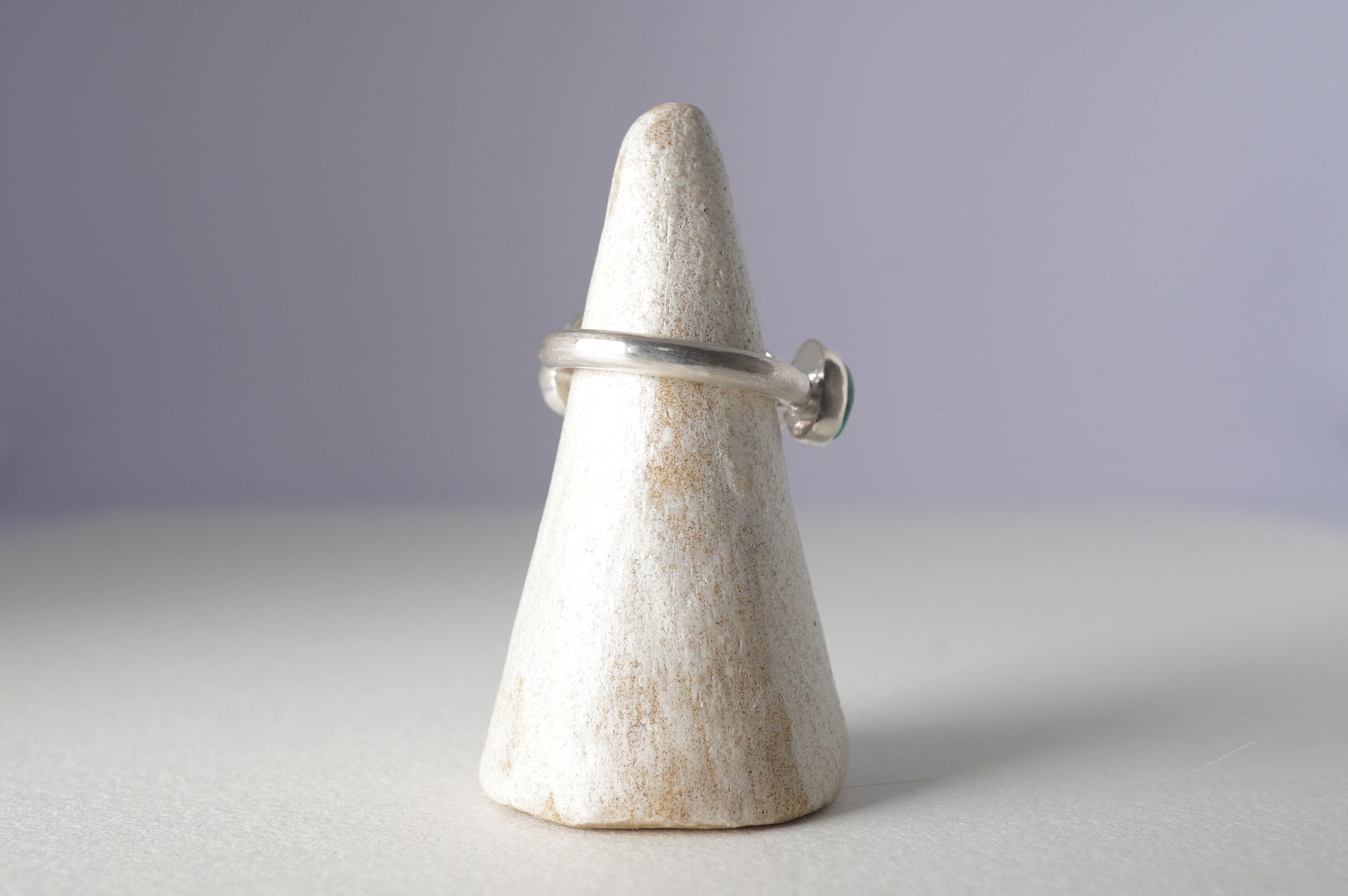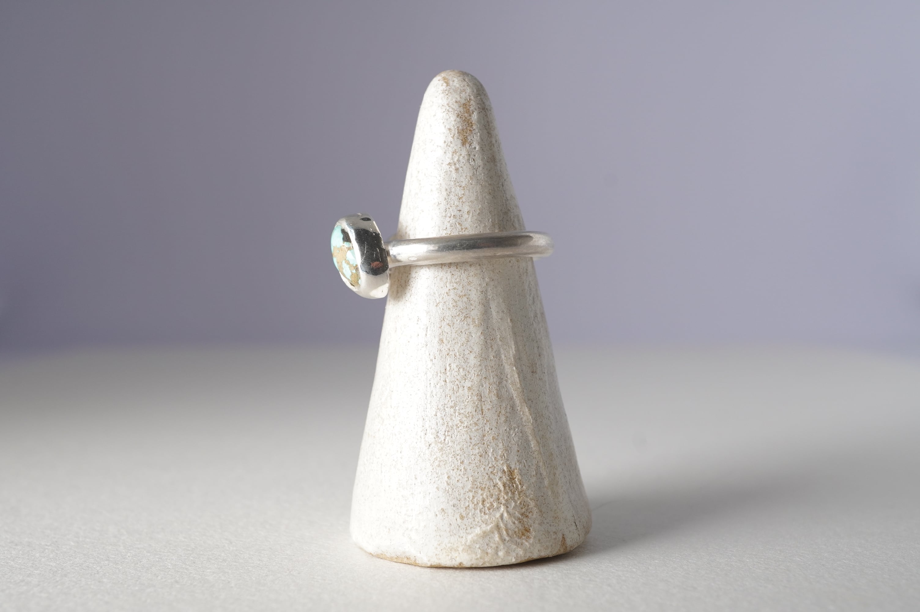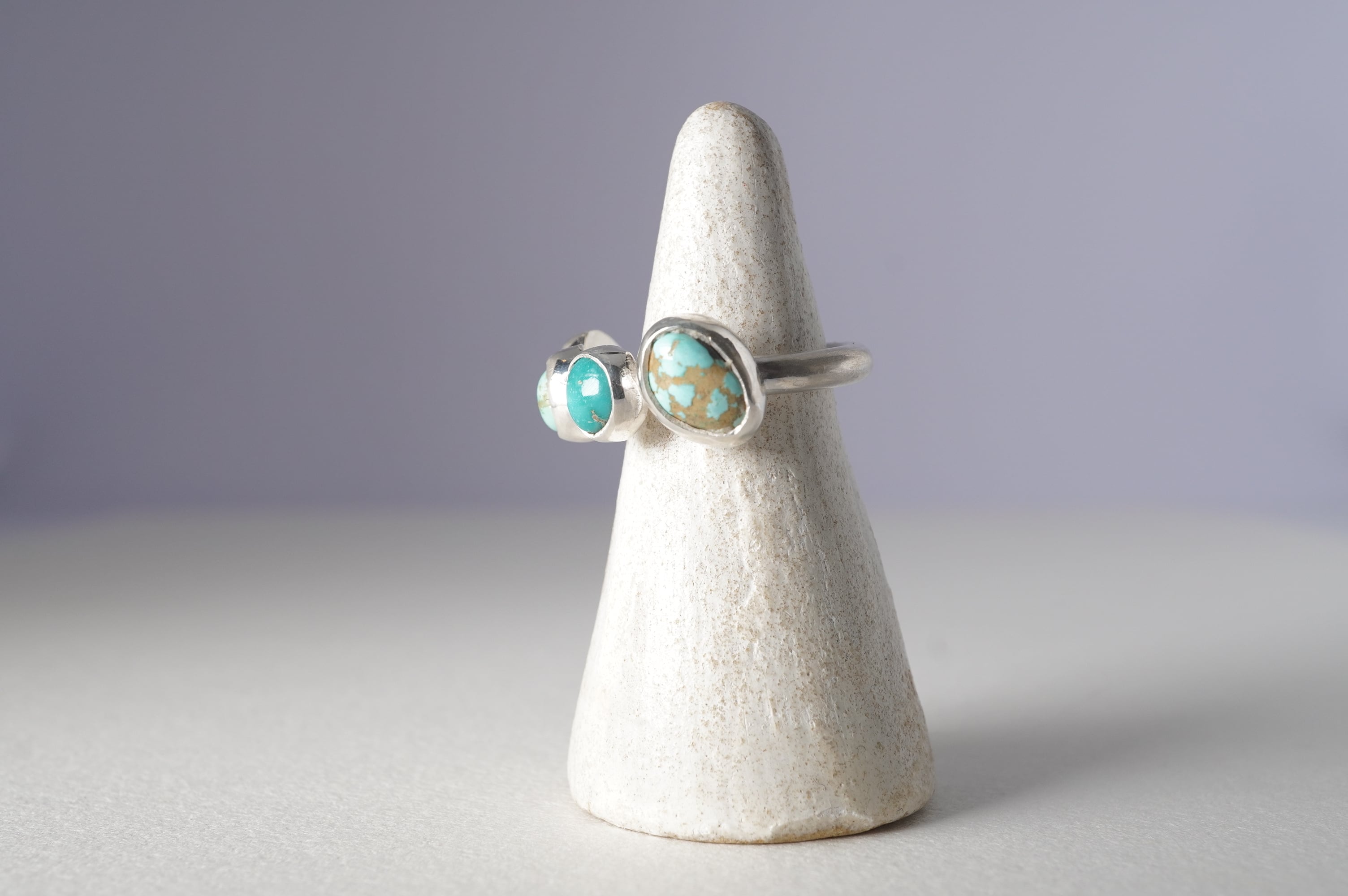 4つの鉱山も色も形もが異なる turquoiseのルースを、角度も変えてバラバラに並べて花冠のようなリ不揃いで愛らしいリングにしました。