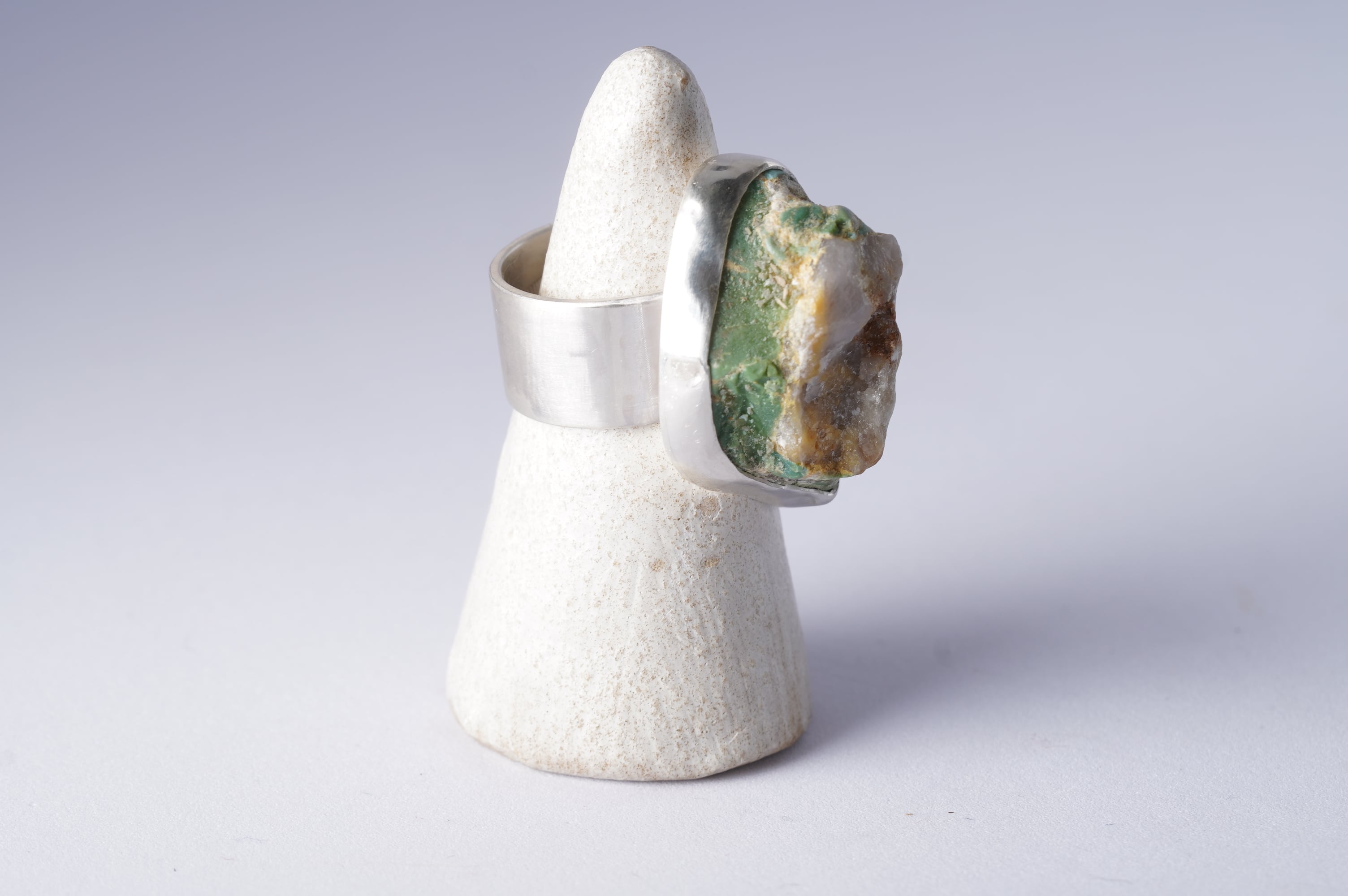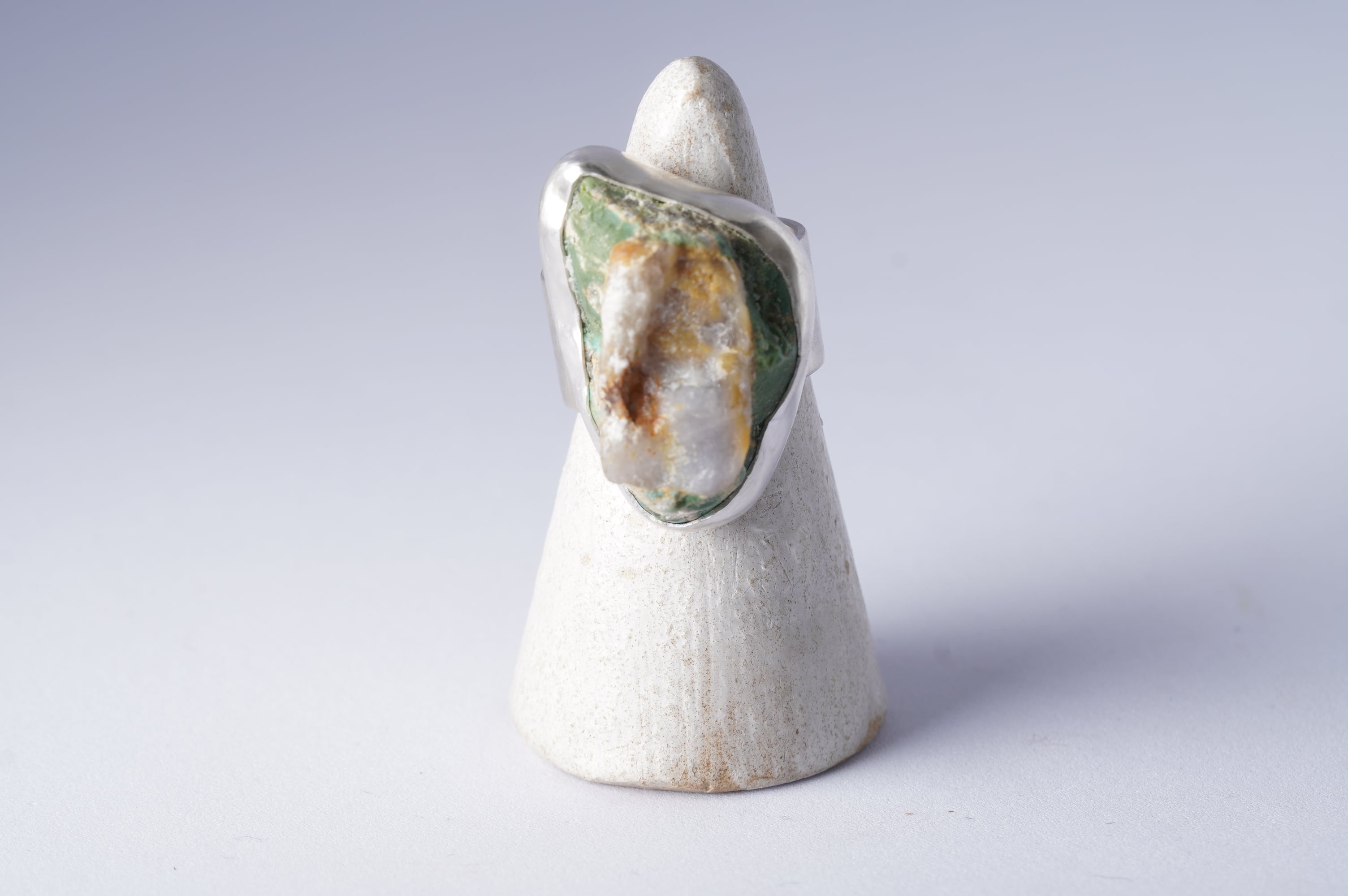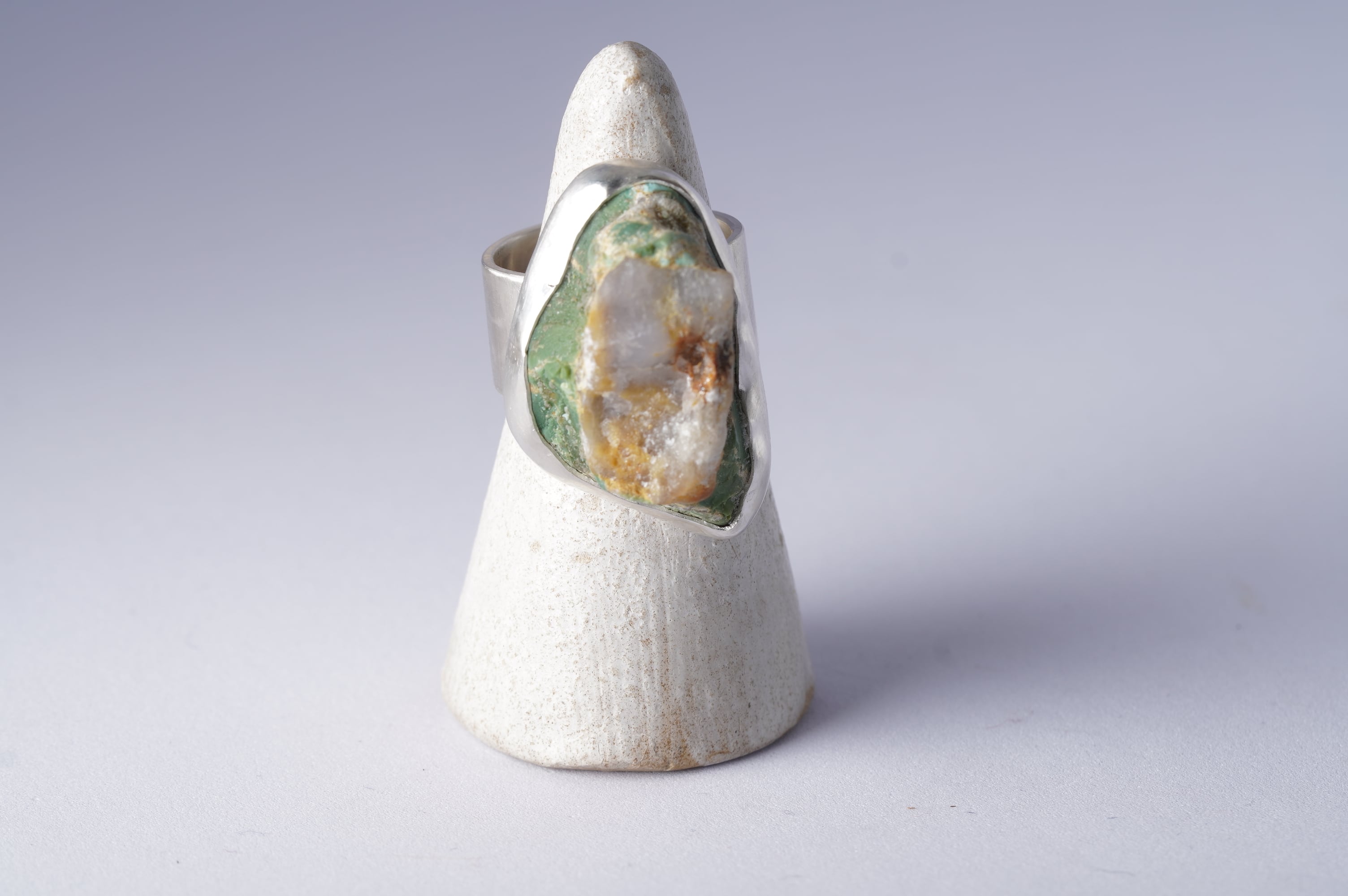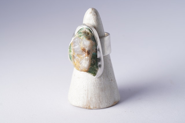 Kingman turquoiseの原石その一部に水晶が付着。その特別な一部を山のように切り取りリングにしました。