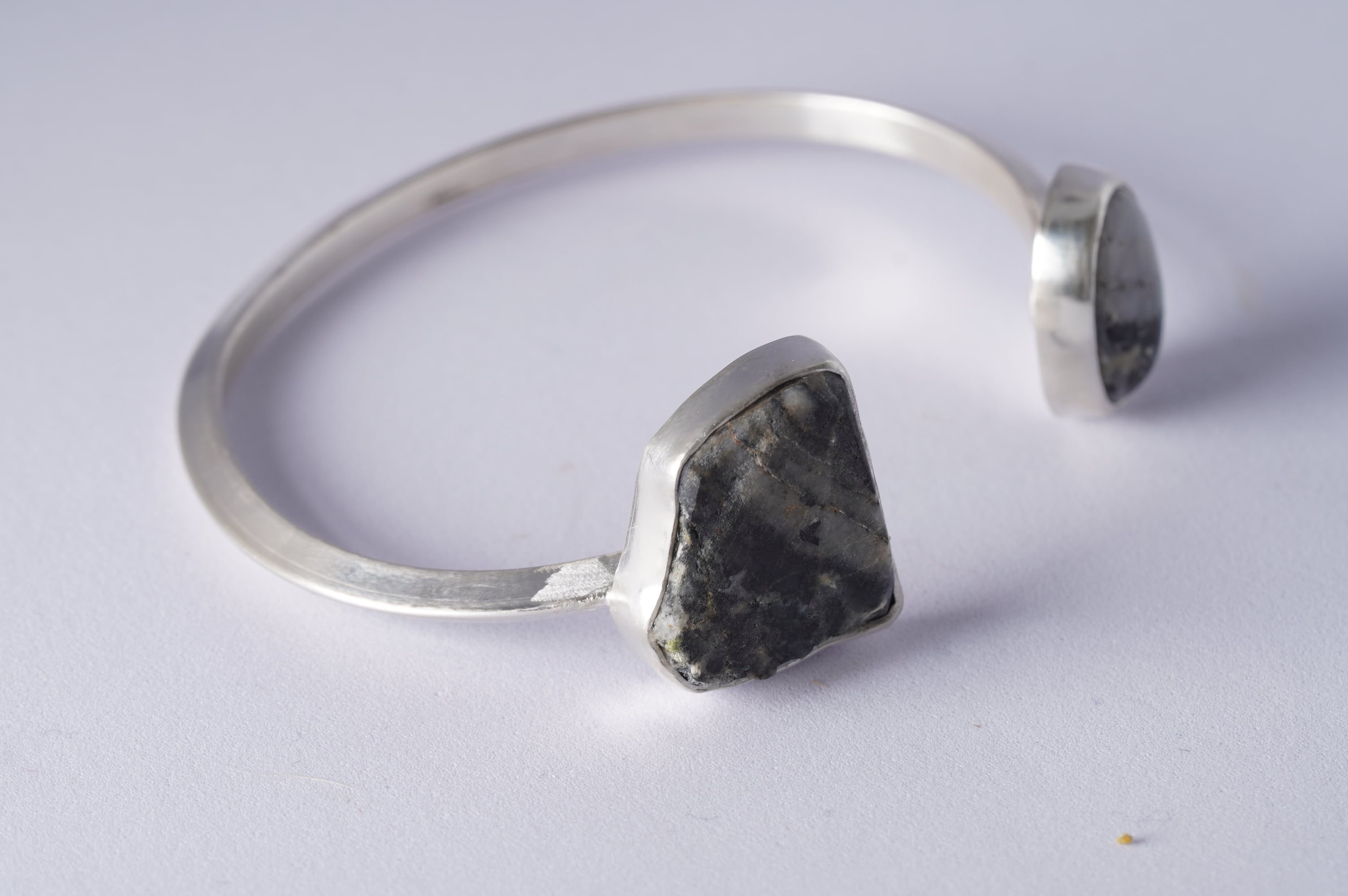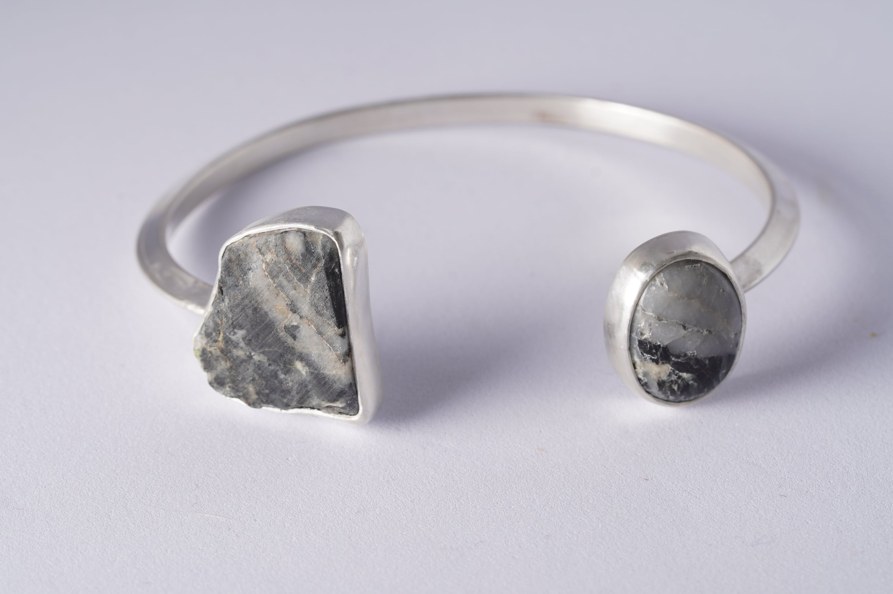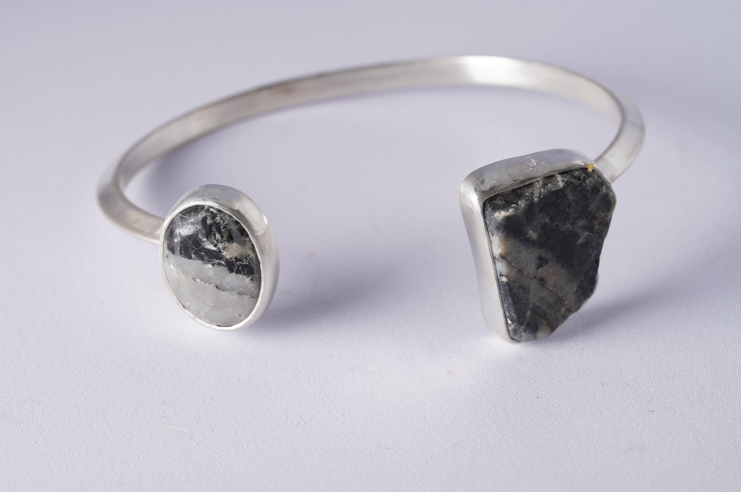 マットつ艶の対比がありながらも斜めに走るモノトーンの柄が二つの石を繋いでいます。