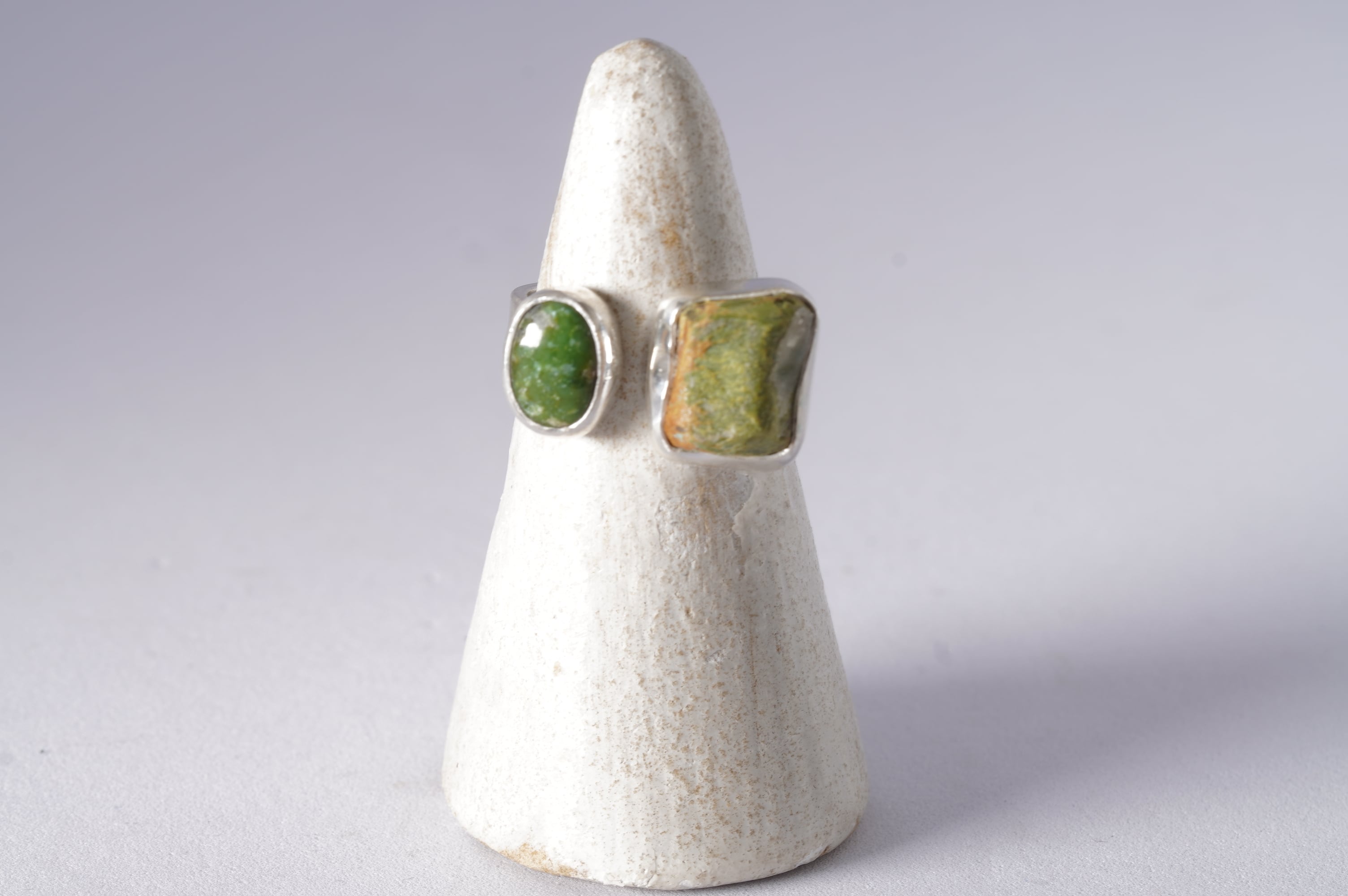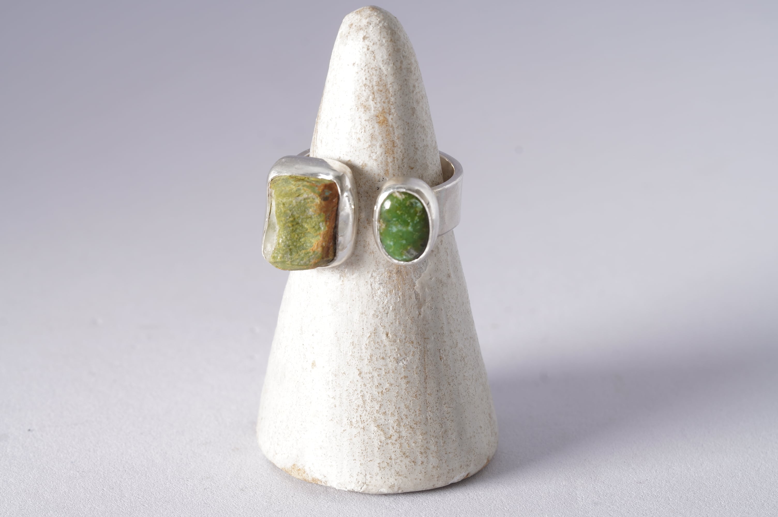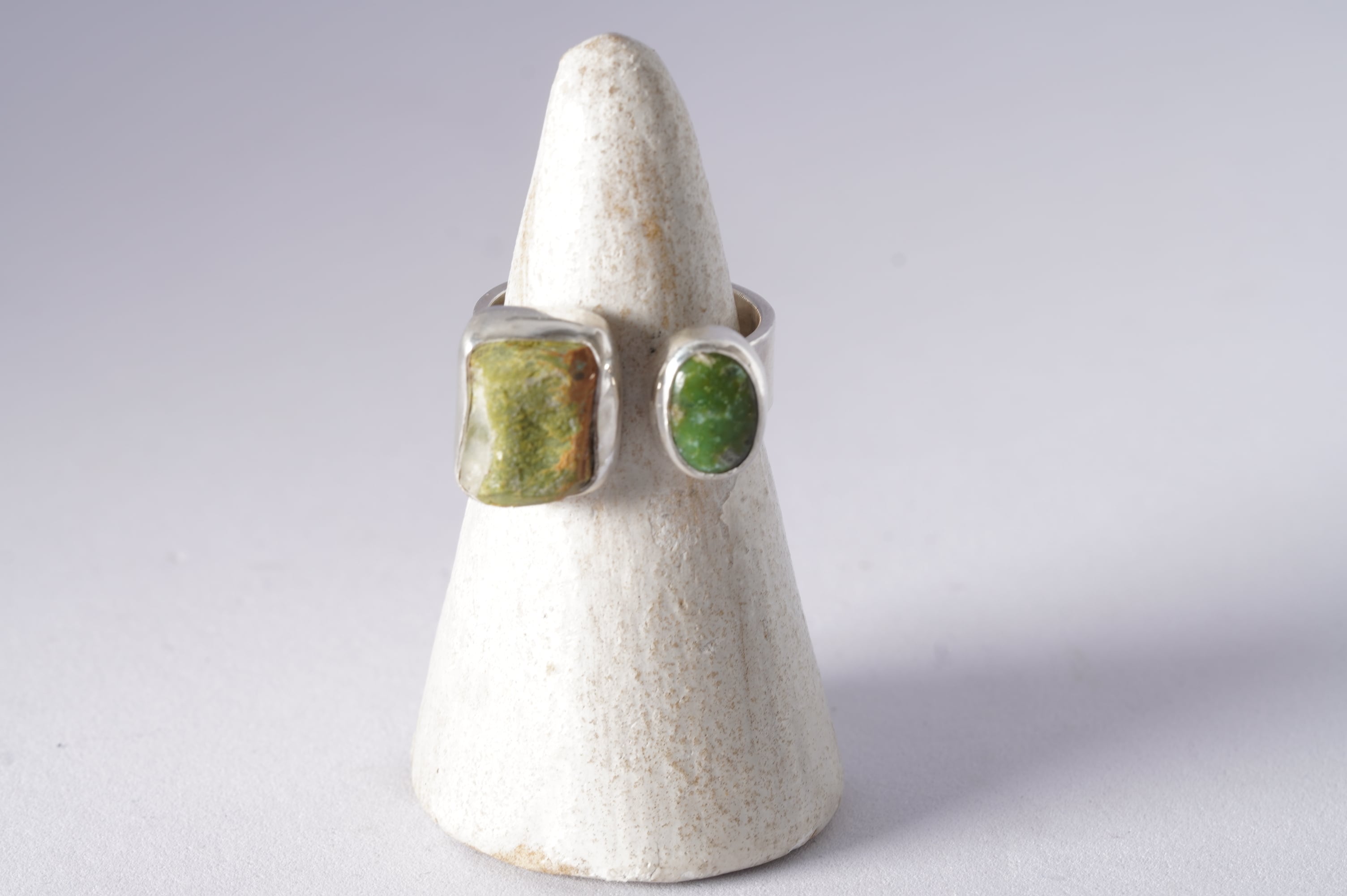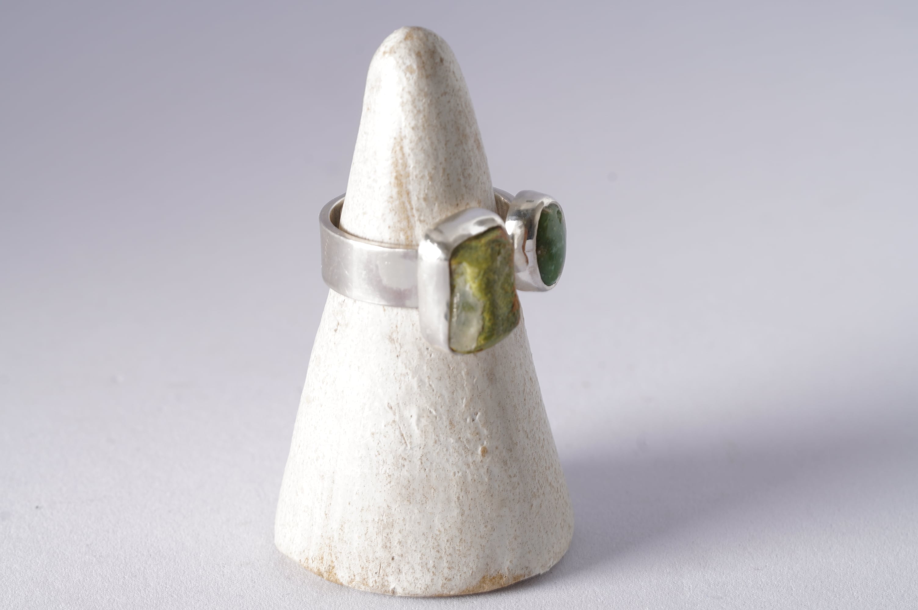 相反する艶のある緑の小さなルースを添えました。