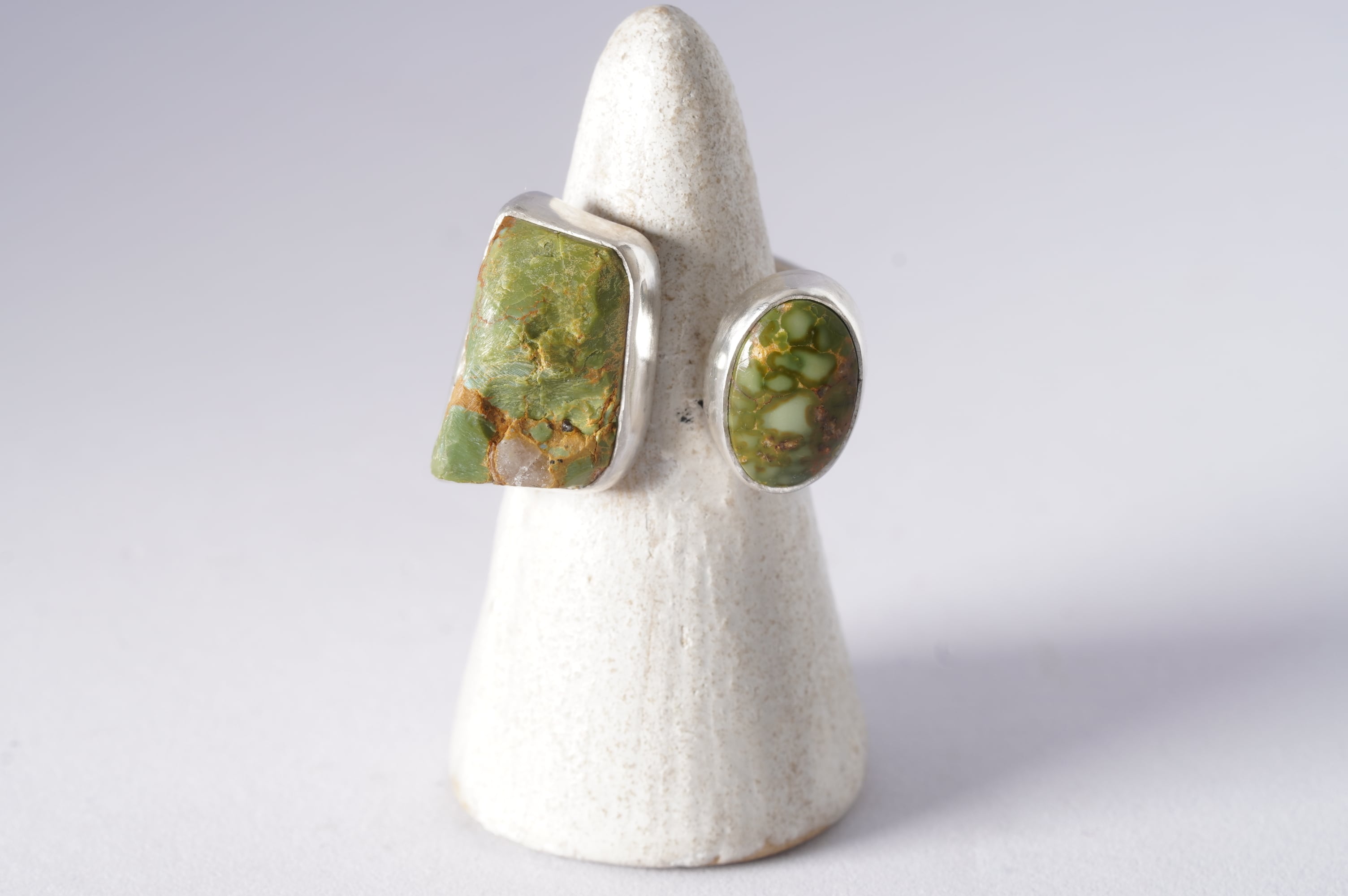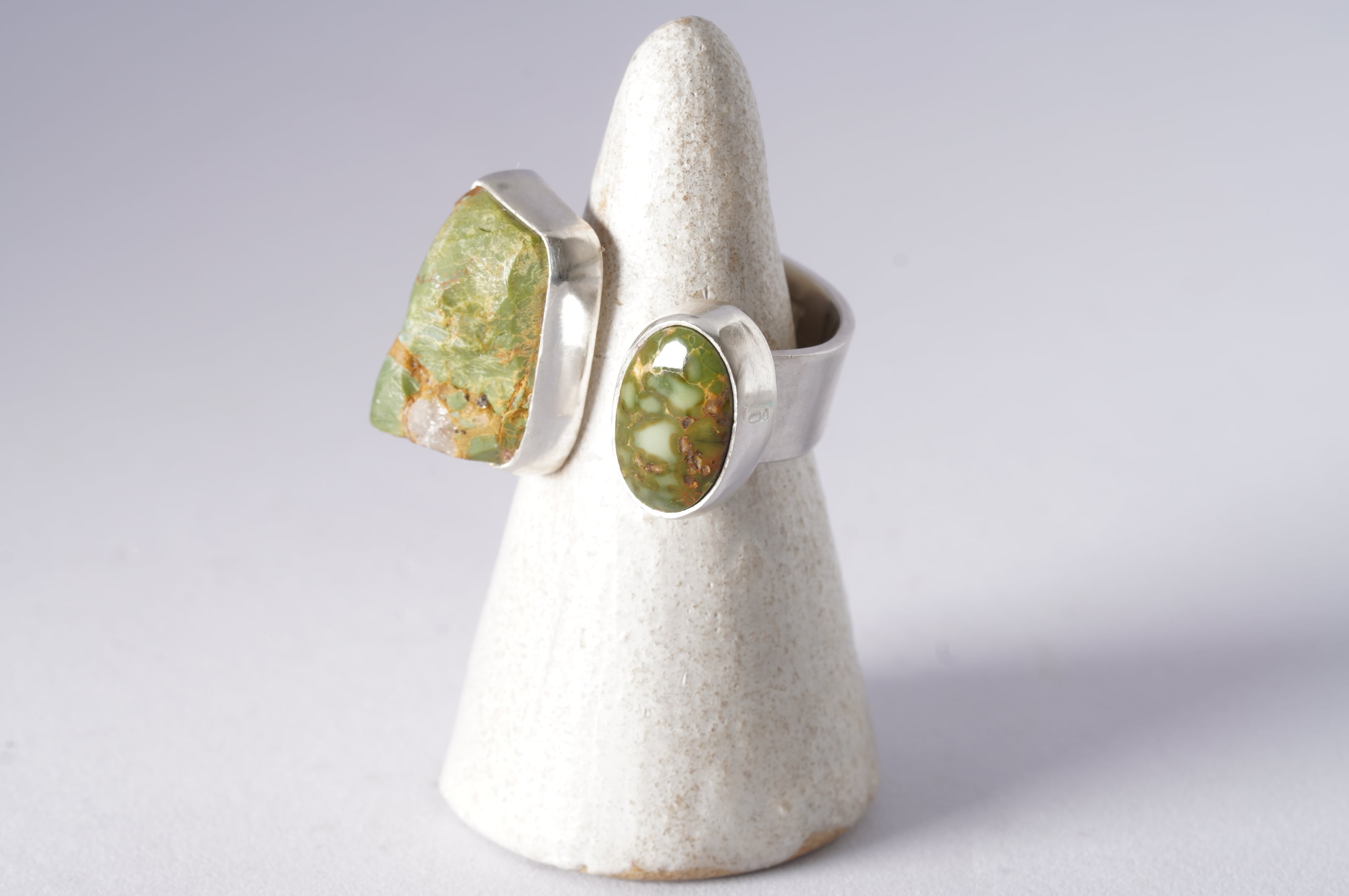 相反する艶のある緑の小さなルースを添えました。
